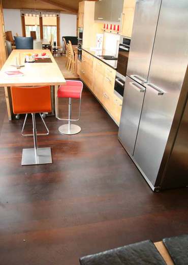 Wir haben unsere eigene Buche zu Thermoholz verarbeiten lassen und daraus schon mal einen Tisch für unsere Testessergäste auf der Consumenta gebaut und den Boden in unserer Ausstellung daraus gefertigt. Durch die Holzbehandlung bei 160 Grad verfärbt sich die Buche bis zum tiefen schwarz (das waren unsere ersten Experimente, oder nur bis zu einem harmonischen Nussbaumton.