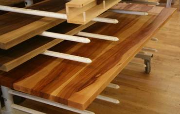 Zum Beispiel Buchentisch mit viel Kern 200 mal 100 cm für 1600 Euro, ein traumhafter Nussbaumtisch in 260 mal 109 cm plus zwei Ansteckplatten, ein Buchentisch mit Verwachsungen, feucht gelagertes Holz oder ein Tisch aus Apfelbaum, 175 mal 85 cm.