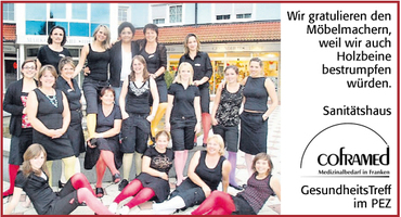 "Wir gratulieren den Möbelmachern, weil wir auch Holzbeine bestrumpfen würden." (Wobei man wissen muss, dass der Stützstrumpf nicht mehr nur in dem gleichnamigen Beige, sondern auch in poppigen Farben existiert, siehe Foto) Sollte diese Anzeige jetzt die Umsätze ankurbeln, dann lernen wir einfach alle daraus, dass ein guter Schuss Humor (nicht nur in der Werbung) das Leben einfach angenehmer und schöner macht, denn auf diese Anzeige, wurden wir am meisten angesprochen. Wir haben alle Anzeigen auch auf einer Sonderseite chronologisch untereinander gestellt.