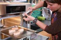Die neuesten Mielegeräte in edlem Gehäuse aus Kirschbaum. Ein Salamander ist ein Gerät zum Überbacken, das sich nach getaner Arbeit in der Arbeitsplatte versenkt. Der neue 90 cm breite Backofen ist das Miele Flagschiff, nicht nur weil er mit seinen beiden Heizsystemen in 4 Minuten auf 180 ist – Grad versteht sich.