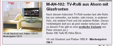 Sie können jetzt einfach den Produktcode in eine Mail packen und Ihre Gebot dazuschreiben. Sollte das der höchste gebotene Preis sein, dann bekommen Sie den Zuschlag und können das Möbel, den Stuhl oder das Küchenzubehör abholen, wenn Sie wieder im Lande sind. Aber viel schöner wäre es natürlich, Sie könnten sich die Möbel auch im Original anschauen.