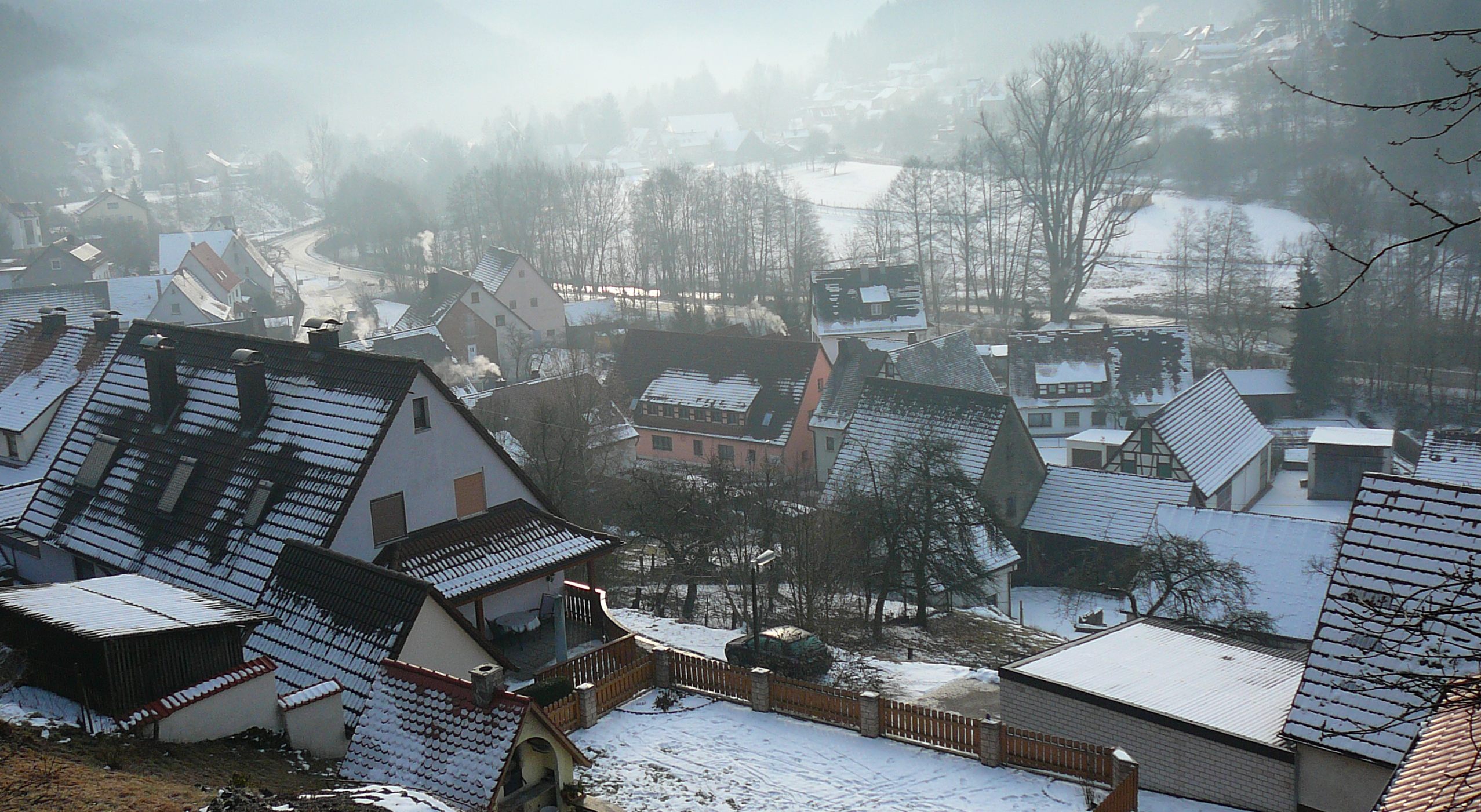 Unsere winterliche Hutangerwanderung endete mit einem nachdenklichen Blick auf das Dorf Artelshofen, über dem noch ein paar flache Sonnenstrahlen den Nebel zurückhielten. Es sollte bald regnen.