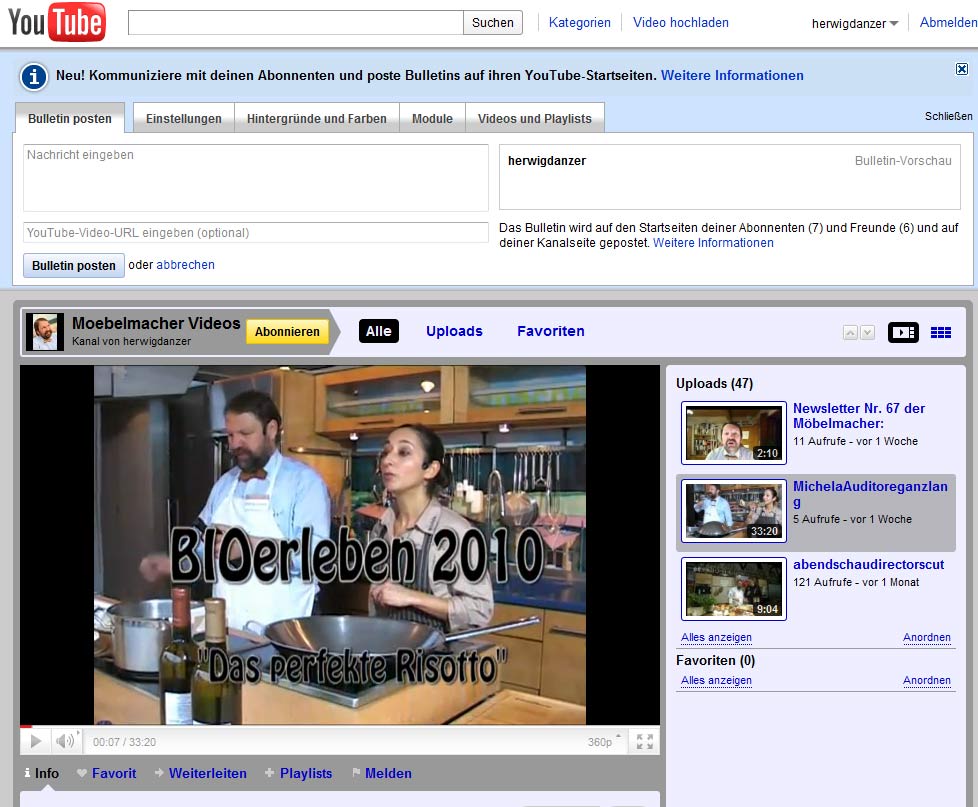 Von dort aus werden die Videos von den Kochshows oder die neuen Einführungen in den jeweiligen Newsletter im Nachhaltigkeitsblog, dem Social Media Newsroom oder auf der Hompage eingebettet. Videos gibt es außerdem von den Vorträgen am Social Media Abend, von Supercharge im Hersbrucker Kick ev., vom Rösle-Knoblauchschneider und natürlich von den Fernsehbeiträgen über die Möbelmacher im ZDF oder beim Bayerischen Rundfunk (zum Beispiel La Vita).