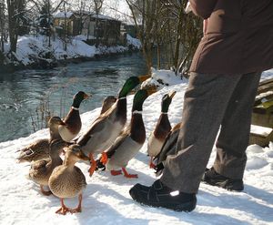 den Schuhen Spikes, im Plastiksack klein geschnittene Brotreste, so machte ich mich auf an die Pegnitz mit dem Gedanken, den Enten und Erpeln eine Freude zu bereiten, sie sollten doch auch ein wenig von Weihnachten spüren.Ich konnte kaum an die Brotresten ran, so schnell wurde ich lauthals bestürmt: Hunger!