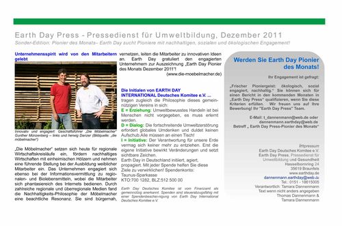 Earth Day gratuliert den engagierten Unternehmern zur Auszeichnung „Earth Day Pionier des Monats Dezember 2011“! (www.die-moebelmacher.de)