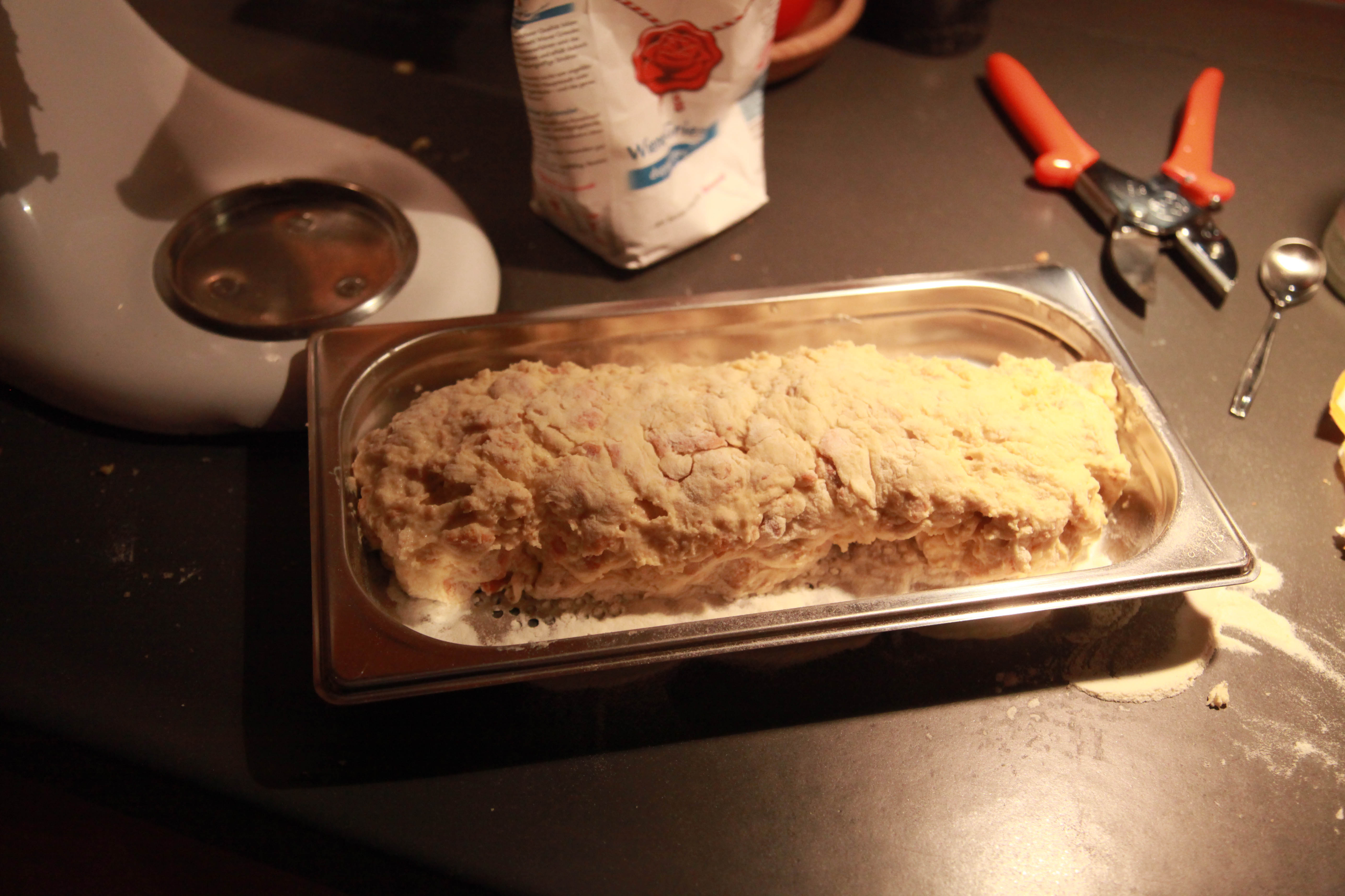 In der Zwischenzeit ist der Fond gesiebt (oder Flotte Lotte) und zum Reduzieren auf das Kochfeld. Böhmische Knödel machen wir mit Mineralwasser, Mehl, Semmelwürfeln, einem Ei, Salz und Backpulver und geben den Teig direkt aus der Kitchen Aid in den gelochten Garbehälter, wo er bei 85 Grad in 35 Minuten fertig gart.