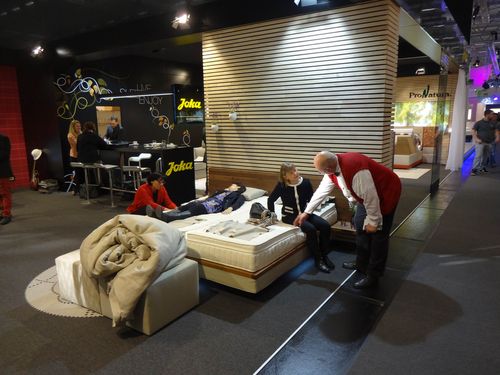 Ein durchgeplanter Messebesuch beginnt für die Kompletteinrichter meist in der Bettenhalle, wo die Firma Pro Natura das erste Natur-Polsterbett in der Technik der Boxspringbetten namens „Woodspring“ vorstellte. Rückenschulleiterin Ute Danzer testete die Ergonomie vieler Hersteller, aber „Woodspring“ war das einzige, das durch veränderbare Holzlamellen zusätzlich auf die persönlichen Bedürfnisse eingestellt werden kann.