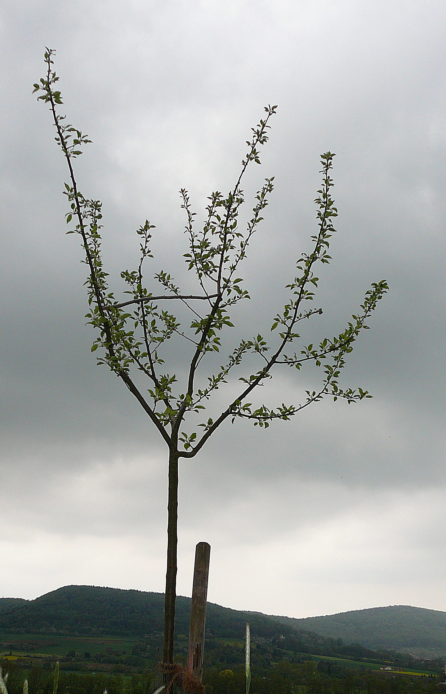 Der Sternapi ist eine der ältesten Apfelsorten, findet sich noch in verschiedenen Sortengärten und ausserdem auf der Streuobstwiese Hersbruck. Seit der Pflanzung des Bäumchens vor vier Jahren warte ich geduldig darauf, dass er mir endlich seine Blüten zeige. Dies ist nun geschehen und ich freue mich riesig darüber. Als Patin bin ich nicht Besitzerin, aber immerhin habe ich eine gewisse Verantwortung übernommen, dass er gut gepflegt und gehegt wird. Ich muss allerdings gestehen, dass ich ab und an so meine Probleme mit den Schnitten und Verbiegungen hatte. Aber mit jedem Eingriff mehr durch den Spezialisten Josef Weimer und dem Organisator der Streuobstinitiative Hersbrucker Alb e.V., Ottmar Fischer, minderten sich meine Bedenken. Für ein Foto lege ich mich sogar auf den kühlen Wiesenboden!