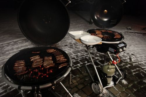 Das Anzünden eines Holzkohlegrills hat sich durch den Anzündkamin deutlich vereinfacht. Einfach Briketts in den Anzündkamin (ich schaufel auch immer die beim letzten Grillen dank der Abschaltung der Luftzufuhr nicht verbrannten mit hinein). Selbst die heftigsten Ausläufer des Tiefdruckgebietes namens Xaver konnten bei rund 0 Grad und Schneefall den Anzündvorgang nicht hemmen, einfach Anzünder unter den Kamin auf dem Kohlerost positionieren und 40 Minuten warten. In dieser Zeit sammelt man normalerweise dann alle Zutaten zusammen, macht die Salate und Soßen.