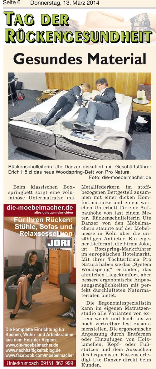Rückenschulleiterin Ute Danzer von den Möbelmachern staunte auf der Möbelmesse in Köln über die unzähligen Anbieter. Ein eigener Lieferant, die Firma Joka aus Österreich ist sogar Boxspring-Marktführer im europäischen Hotelmarkt. Mit ihrer Tochterfirma Pro Natura haben sie zusätzlich das "System Woodspring" erfunden, dass ähnlichen Liegekomfort, aber wesentlich bessere ergonomische Anpassungsmöglichkeiten mit perfekt durchlüfteten Naturmaterialen bietet.