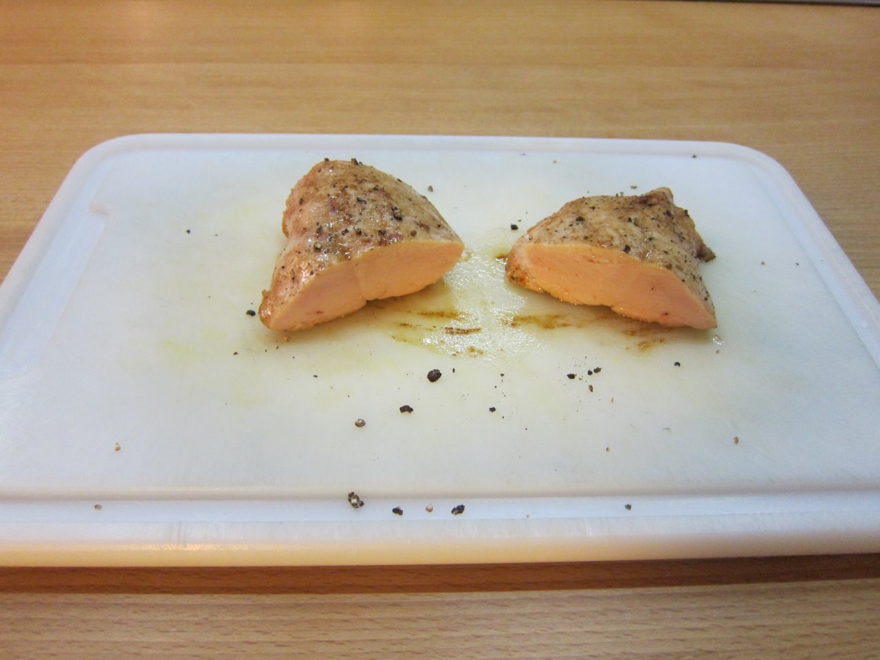 Nach Ablauf der Zeit habe ich die Hähnchenbrust gesalzen und in der Pfanne rundrum zusammen mit dem Thymian angebraten, nach kurzer Ruhezeit dann gepfeffert und angeschnitten.
