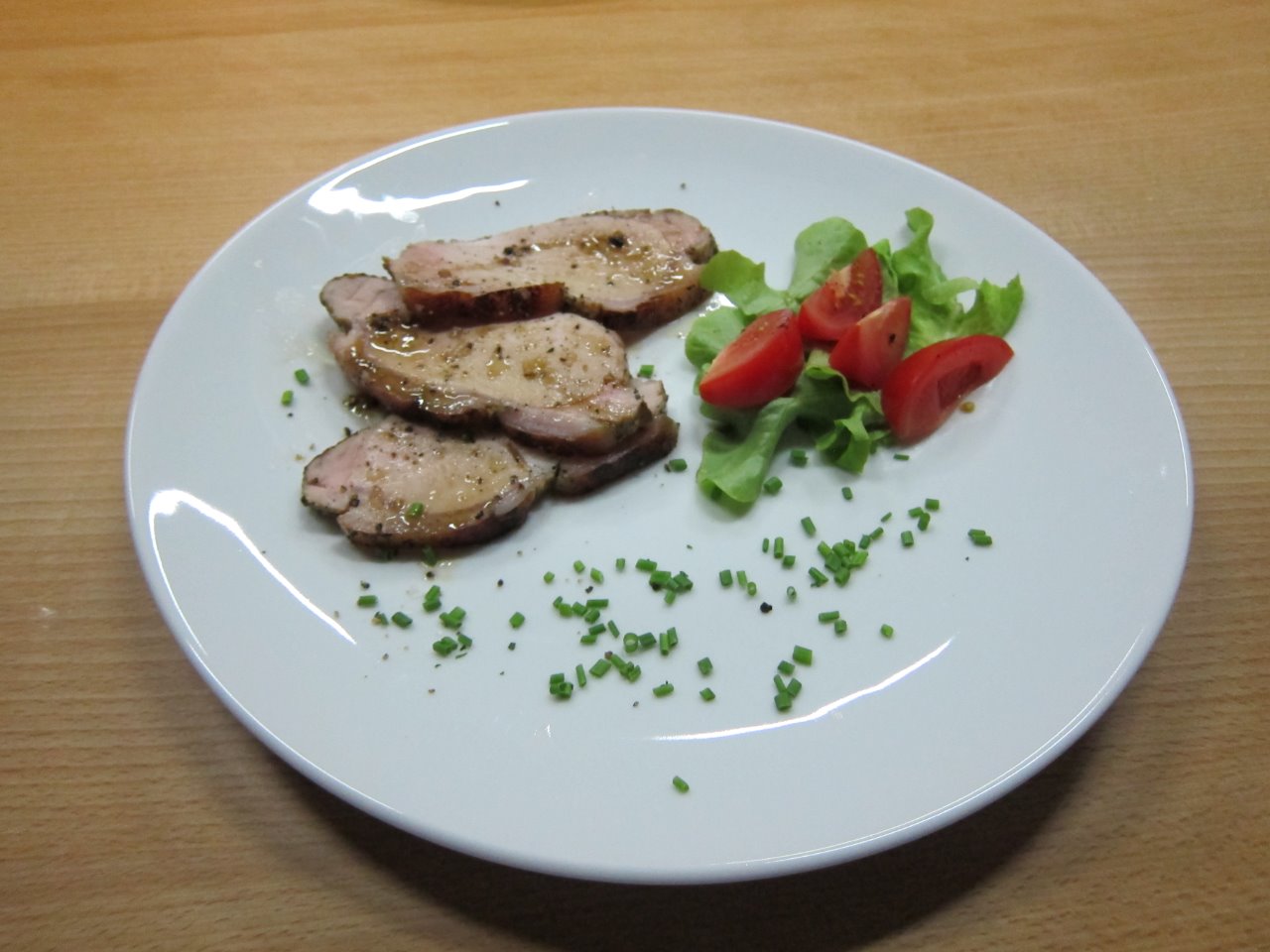 Und nun zu den Sous Vide-Erfahrungen. Für unseren Geschmack war das Fleisch, als es dann auf dem Teller war, etwas zu sehr “durch”. Trotzdem war es butterzart und immer noch saftig. Beim nächsten Mal werde ich das Fleisch deshalb nicht bis zur gewünschten Kerntemperatur im Wasserbad lassen, sondern ca. 2-3 Grad vorher rausnehmen – dann hat man noch Spielraum beim weiteren Verarbeiten. Auch die Kruste war nicht optimal. Das Foto zeigt, dass die Pfanne wohl zu heiß, die Kruste deshalb teilweise angebrannt und nicht überall rösch war. Da empfiehlt sich vielleicht doch, den Braten nur rundherum kurz anzubraten und die Kruste dann 10 Minuten unter’m vorgeheizten Backofengrill rösch zu grillen. Beim nächsten Mal sollte das dann besser klappen. Aber dennoch haben wir den Spanferkelrücken genossen.
