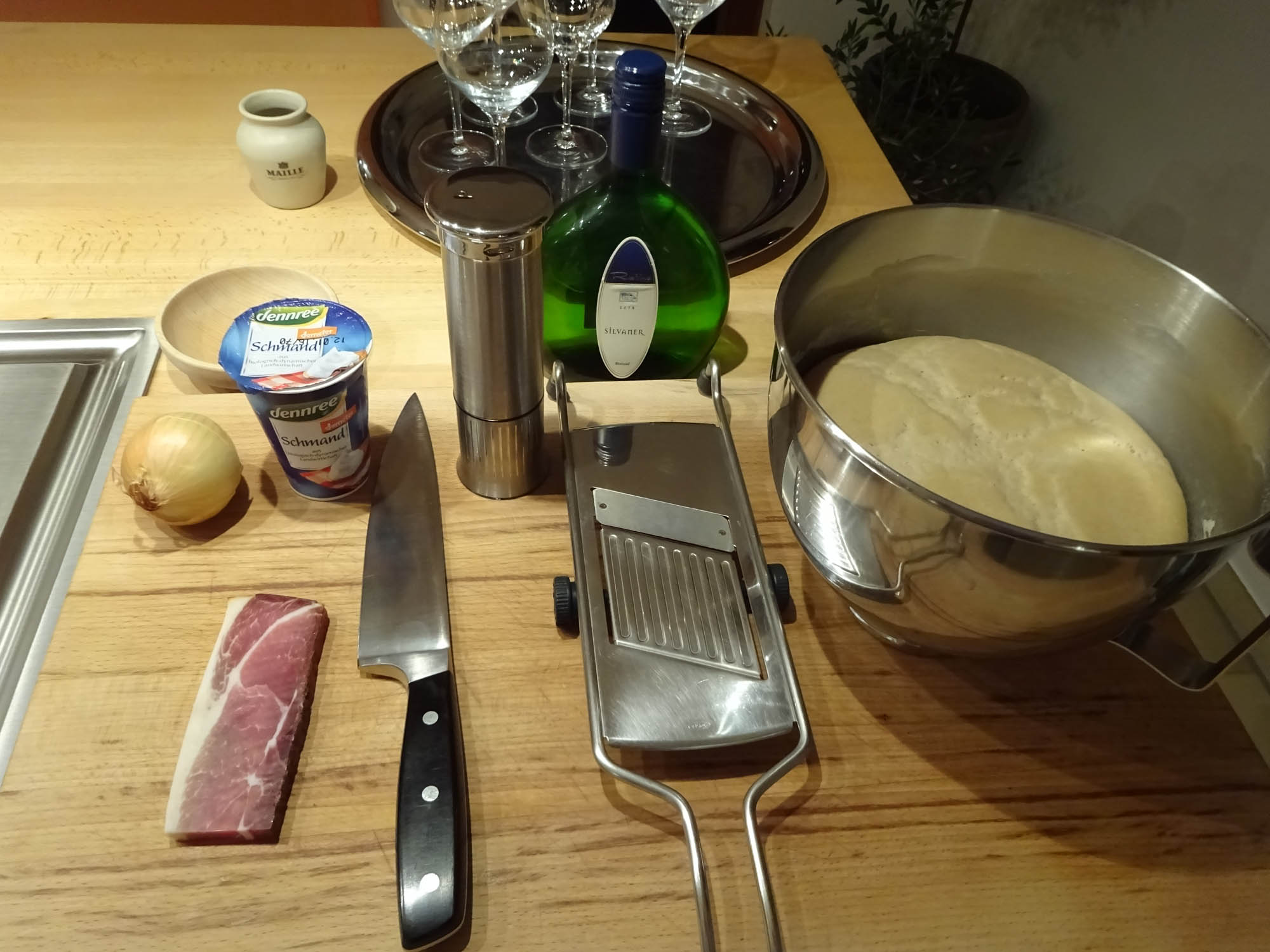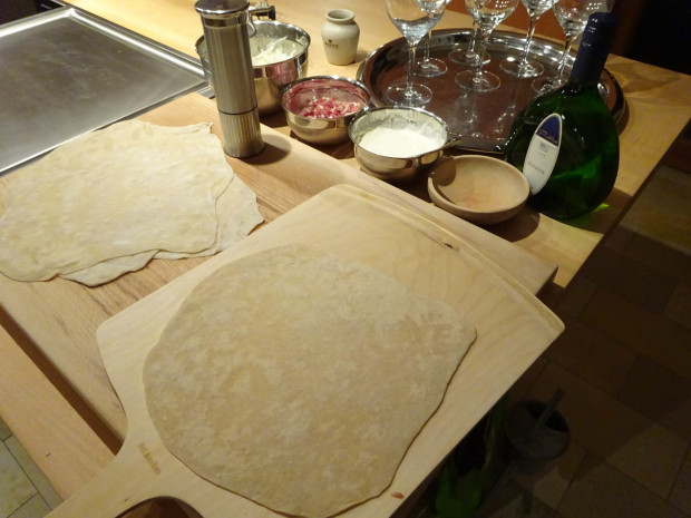 Unser Trick in Möbelmacherküchen ist, dass wir den Teig auf der Laborkeramik, dem Granit oder auch auf dem Holz mit viel Mehl nahezu durchsichtig ausrollen und wenige Sekunden am  180 Grad warmen Tepan Yaki (oder auch im Backofen) vorbacken. Wenn dann die Gäste kommen ist der ganze Mehlstaub schon weg, die Teigfladen stabil und die Gäste können sogar selbst mitarbeiten, denn es ist wirklich „einfach Kochen“!