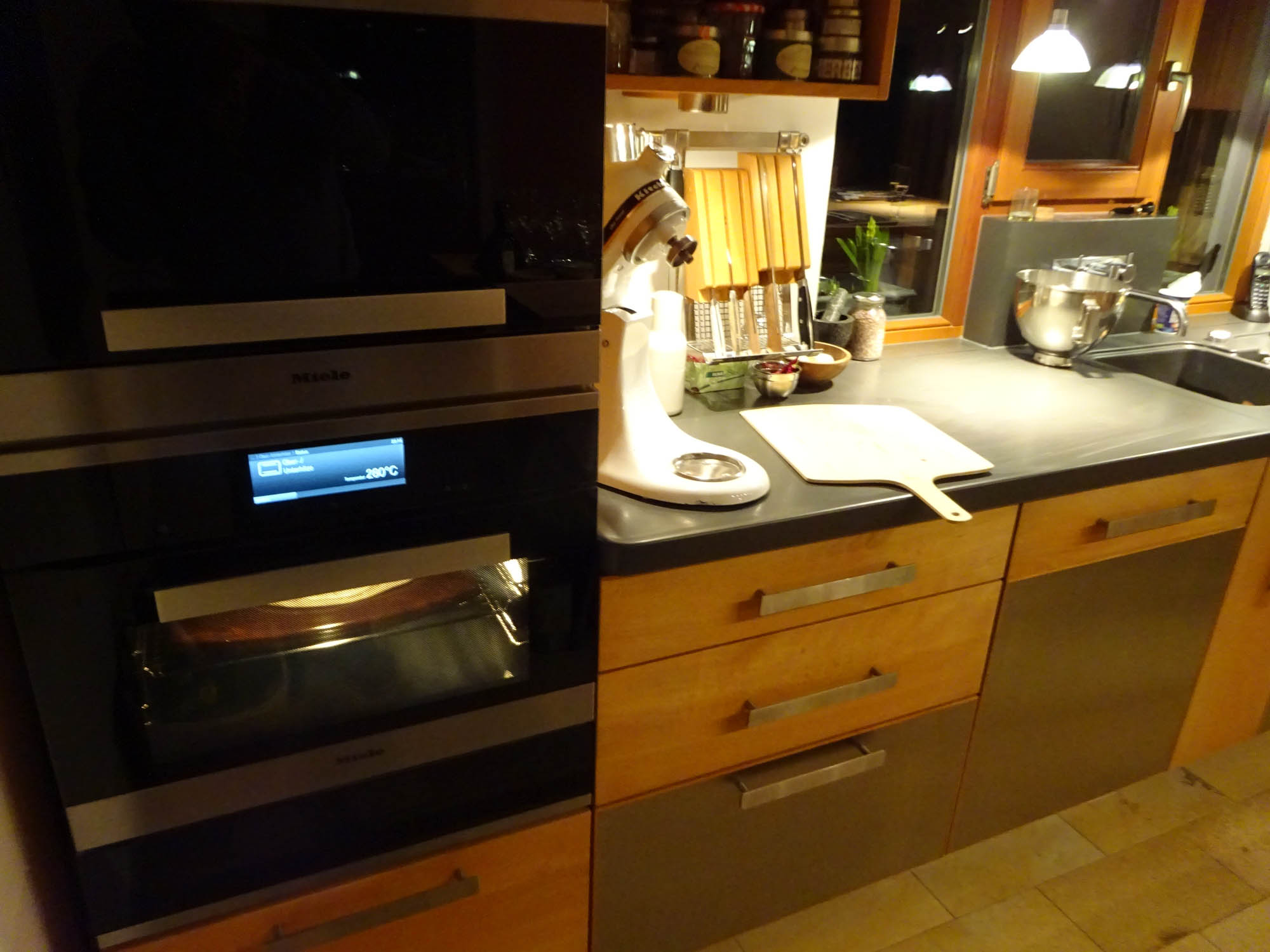 Die Spezialglasur des Miele-Backsteins ist nicht so offenporig wie andere heftig beworbene Backsteine, dafür lässt er sich aber auch nach einer langen Nacht bei 280 Grad mit viel übergelaufener Tomatensauce, klebrigen Käse und eingebrannter Salami  supereinfach reinigen und macht am nächsten Tag gleich wieder Freude. Verblubberte offenporige Backsteine oder testweise eingesetzte – perfekt funktionierende, aber heftig verschmutzte -Granitplatten mussten die private Küche aus optischen Gründen sehr schnell verlassen.
