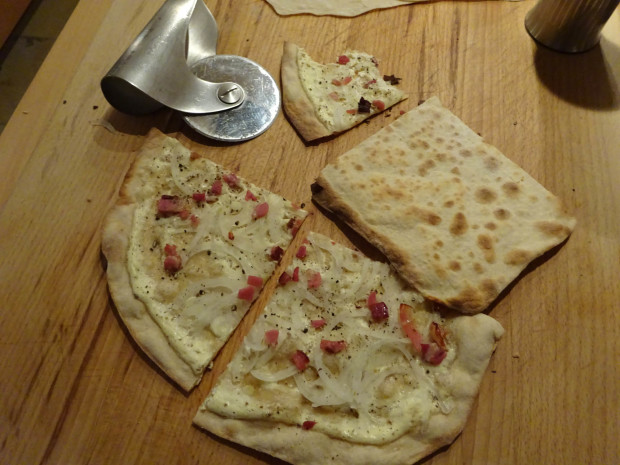 Rund drei Minuten ist die Backzeit des Flammkuchens, dann kann man ihn am Holzbrett aus der Hersbrucker Alb mit groben Pfeffer verfeinern, mit dem Röslepizzaschneider (ich habe noch ein uraltes Designmodell, die neuen funktionieren genauso gut, sind aber nicht so schick) perfekt aufteilen und rein beißen, was richtig knirscht.