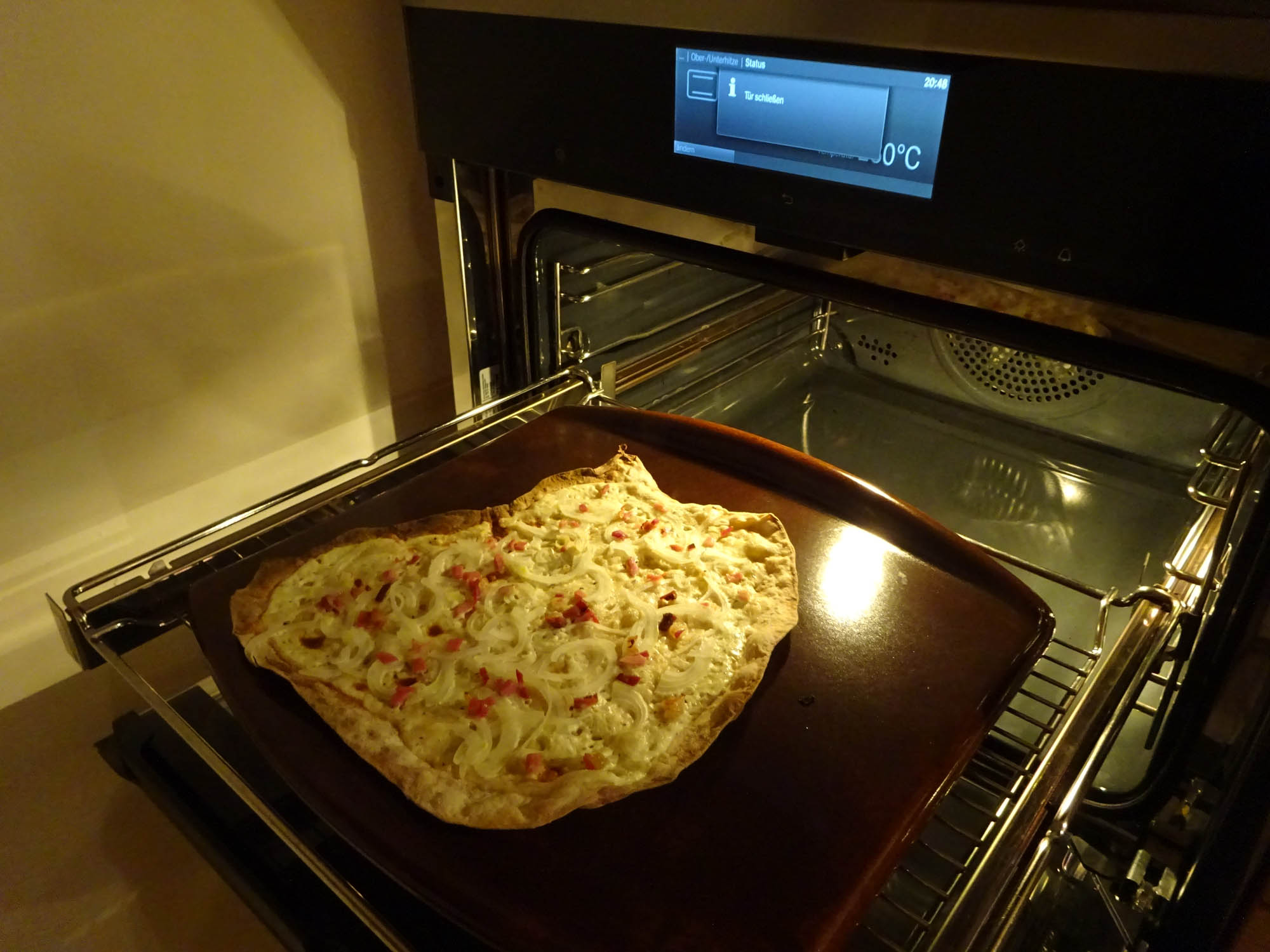 Auf die vorgebackenen Fladen Schmand mit Olivenöl, viel Muskat, wenig Salz (wegen des salzigen Schinkens!) und ein wenig Pfeffer gewürzt,  dünn verteilen.  Mit dem Röslehobel geschnittene halbe Zwiebelringe und die klein geschnittenen Schinkenstücke geometrisch exakt – oder einfach nach Geschmack – portionieren und anordnen und mithilfe des Holzes vom Pizzabackstein oder einfach mit einer Palette (der Teig ist ja vom Vorbacken auf dem Tepan Yaki sehr stabil!)  bei 280 Grad auf den glasierten Miele-Pizzabackstein in den Backofen legen.