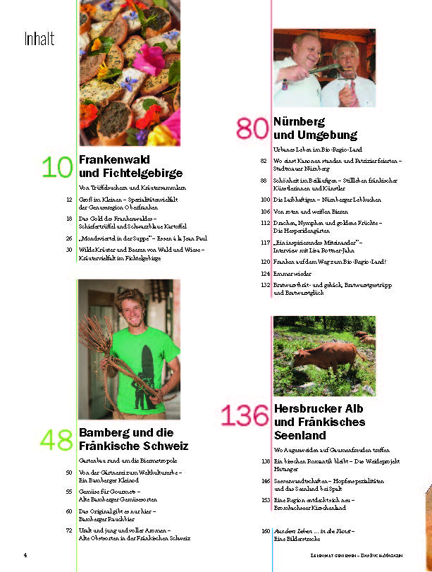 Ein Schwerpunkt liegt auf Spezialitäten mit Alleinstellungsmerkmal, darunter viele „alte“ Sorten und Rassen, die von Liebhabern und Feinschmeckern in jüngster Zeit neu entdeckt wurden. Die Spezialitäten geben Frankens kulinarischer Landkarte ein Gesicht. Mit ihnen ist nicht nur ein einzigartiger Geschmack, sondern in vielen Fällen auch eine gewachsene Kulturlandschaft verbunden, die es zu erhalten lohnt; am besten, indem man die Produkte isst. Genau dies soll der Band „Lebensart genießen“, der sich auch als Genussführer versteht, unterstützen. „Lebensart genießen“ stellt rund 100 exzellente Genusshandwerker ausführlich vor. In Interviews kommen Sternekoch Alexander Herrmann, der Gewürz-Experte Ingo Holland und Event-Managerin Lisa-Rottner-Jahn zu Wort. Aussagekräftige Karten zu jedem Spezialitätengebiet, Rezepte sowie Ausflugs- und Genuss-Tipps runden die Zusammenschau ab.