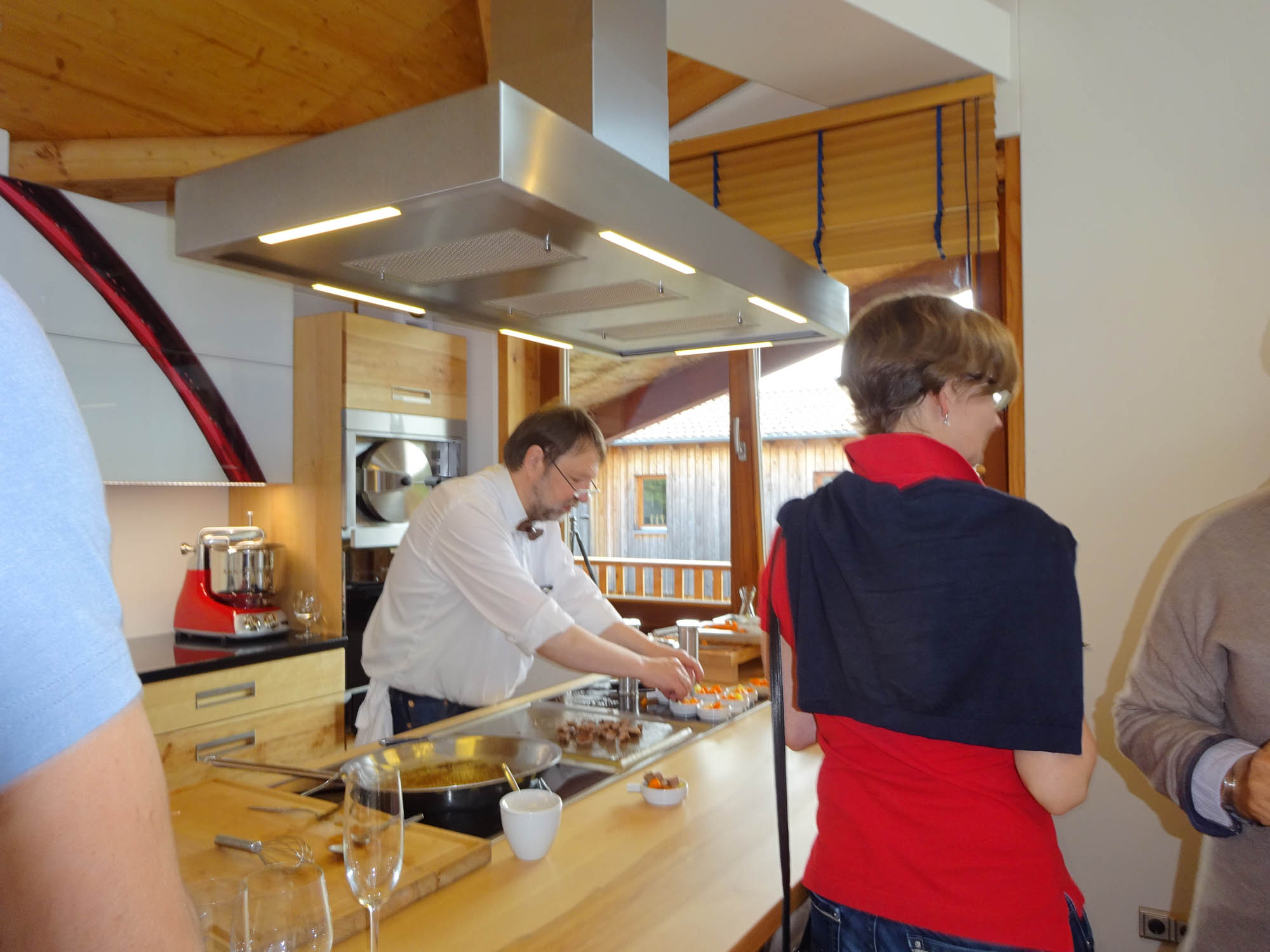 Natürlich gab es nach den Einführungen zum Holz aus der Region und der Einrichtung mit Küchen und Möbeln aus Massivholz auch kleine Verkosterle des vakuumierten Hutangerrinds zusammen mit Kartoffeln und Karotten in unserer Ausstellung. Das haben wir 24 Stunden lang im Sous Vide Thermalisierer bei 57 Grad gegart und nur noch ganz kurz am Tepan Yaki angebraten.