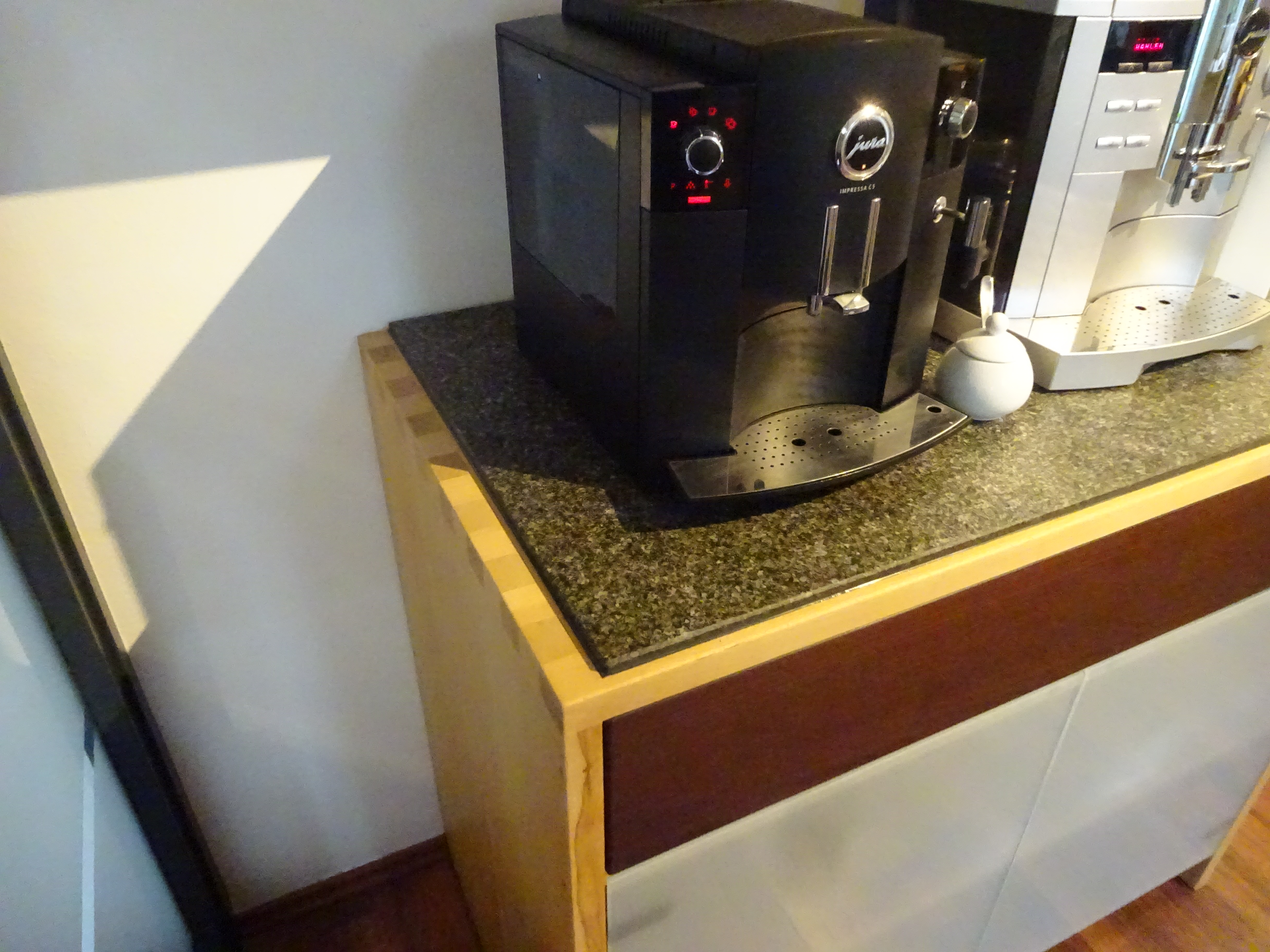 Wir haben in der Kaffeebar mit dem Fotografieren begonnen, wo in handwerklich gezinkten U-Korpussen aus Buche Schubladen mit Thermobuchenfront und weiße Glastüren untergebracht sind. Auch die 90 cm hohen Tische mit den Tresenhockern besitzen diese stilgebende Zinkenverbindung.