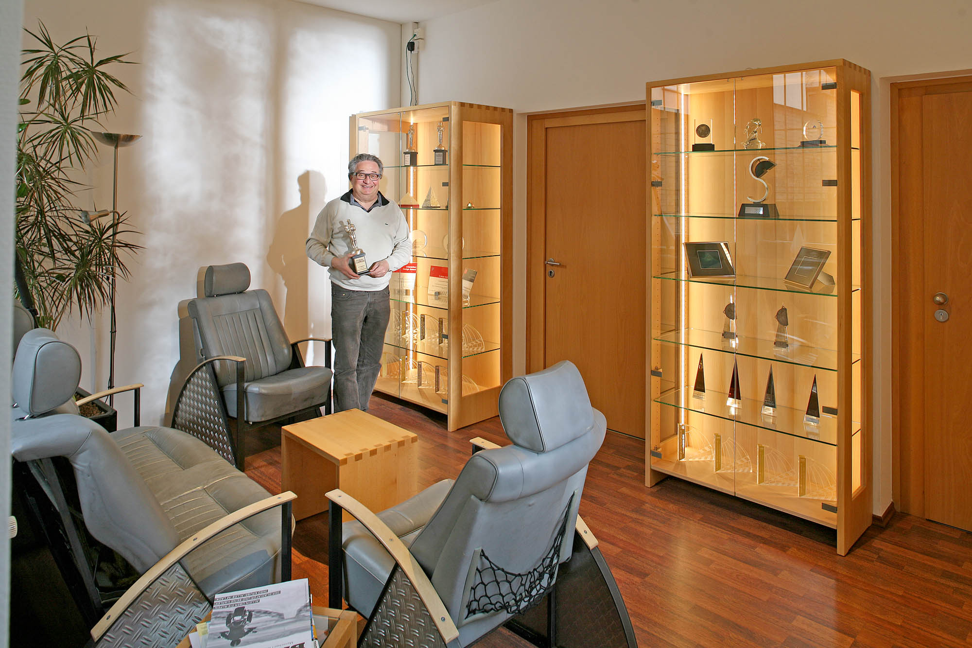 In dieser Lounge vor dem großen Konferenzraum stehen alte Mercedessessel aus einer alten S-Klasse, die auch zum Arbeitsumfeld der Firma passen. Denn die FELDMANN Media Group macht richtig gute Filme – aber noch viel mehr – unter anderem auch für Mercedes-Benz. Hall of Fame heißt dieser andächtige Raum, weil alle bisher gewonnenen Trophäen in unseren Spezialvitrinen mit seitlicher Öffnung aufbewahrt werden. Und so durften wir dann auch den Chef mit dem Preis im Arm fotografieren, ein Foto, dass Sie sicher im Kalender 2018 wiederfinden werden.