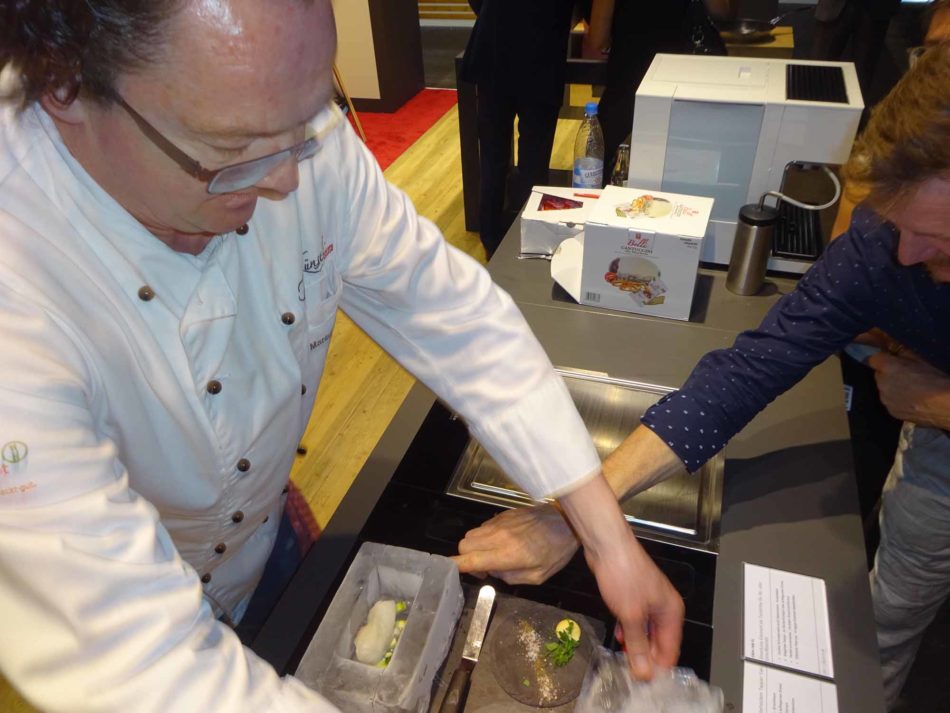 Auch wenn der Dialoggarer von Miele noch gar nicht am Markt ist (wir haben hier schon vom Kochen damit berichtet), ist er natürlich sehr spannend. Wir durften diesmal auch das berühmte Garen von Kabeljau im Eisblock miterleben, das übrigens nur die Gartechnik mit Langwelle demonstrieren soll, normalerweise gart man den Fisch eher ohne Eis.
