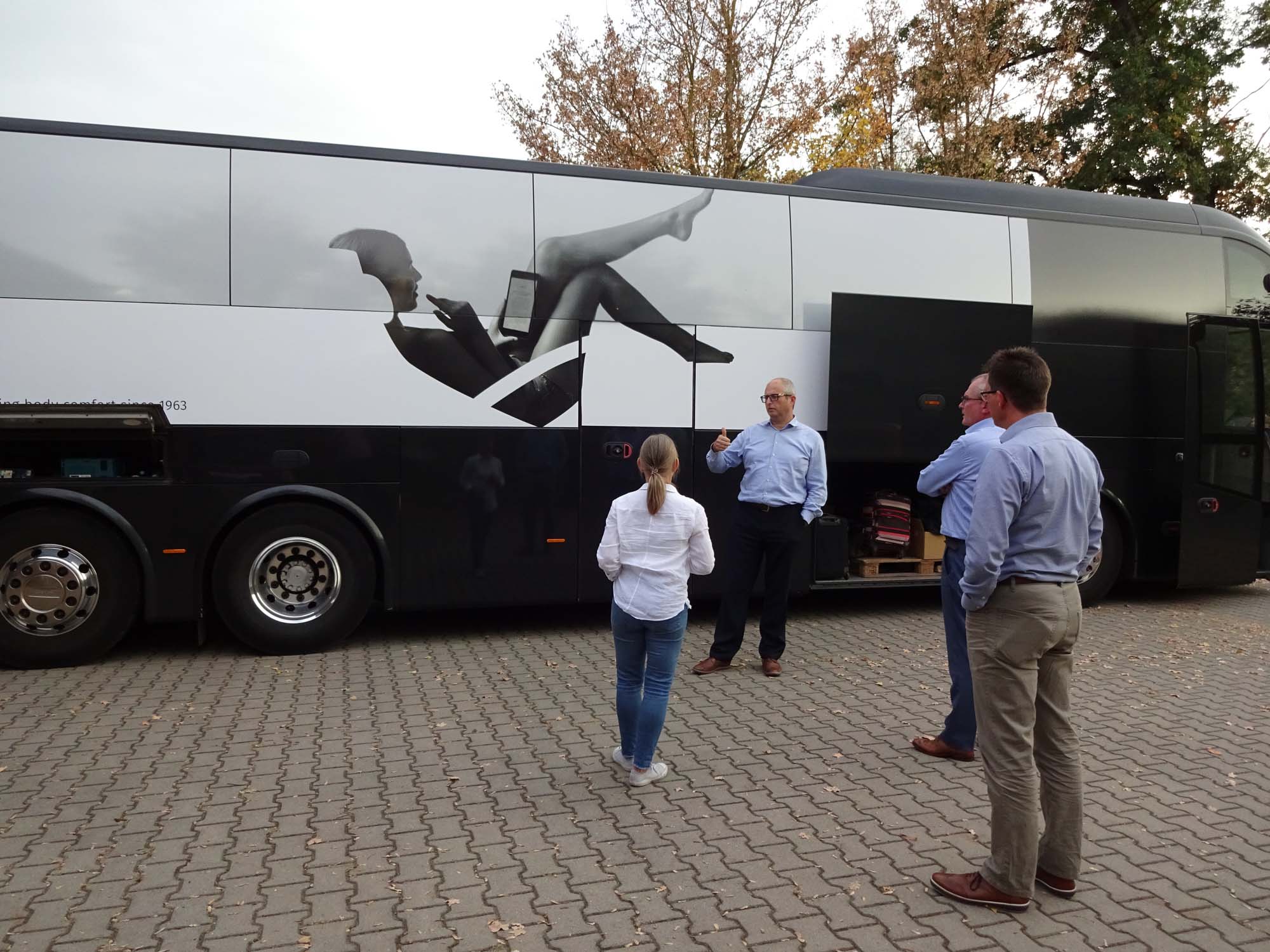 Mit Jori-Geschäftsführer Wim Vantomme, unserem Verkausleiter Jörg Guttenberger, Peter, dem neuen Mann für den Export und Busfahrer Reddy, besuchte uns der Jori Showcar – wie immer geschmückt mit der neuesten Werbekampagne zu den Relaxsesseln. Weil Ute noch in landratsamtlichen Familiengeschichten unterwegs war, haben wir die Zeit erstmal mit Frankensecco, Chips, Weideschweinbauch und der Geschichte über die Messe in Moskau überbrückt, bevor wir den Werbeauftritt für Relaxsessel auf der Außenhaut des Busses betrachteten. Mir gefällt die Reduktion des Sessels sehr gut, aber es wird aktuell mittels Befragungen fleißig getestet, ob sie nicht ein wenig zu weit geht und deren erhoffte Wirkung verfehlt. Wir sind gespannt, was die Marktforscher herausfinden werden.