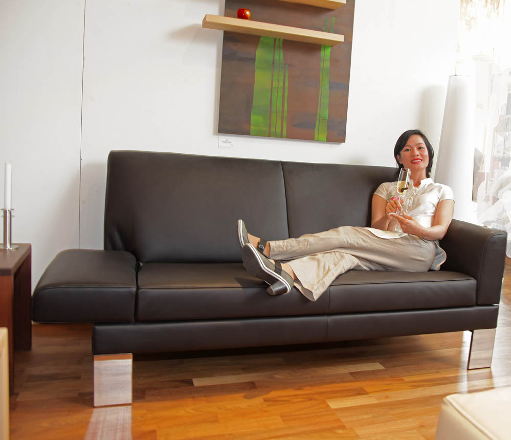 Unser Lieblingssofa Glove hat schlanke Beine bekommen. Perfekter Sitzkomfort, raffinierte Armlehnenmechanik, die ein 165 cm breites Sofa durch Weggklappen auf eine Liegefläche von 205 vergrößert und eine etwas vergrößerte Sitztiefe werden dieses Modell bald in unsere Ausstellung einziehen lassen. Das aktuelle Ausstellungssofa in schwarzem Leder kann uns sehr preiswert verlassen.
