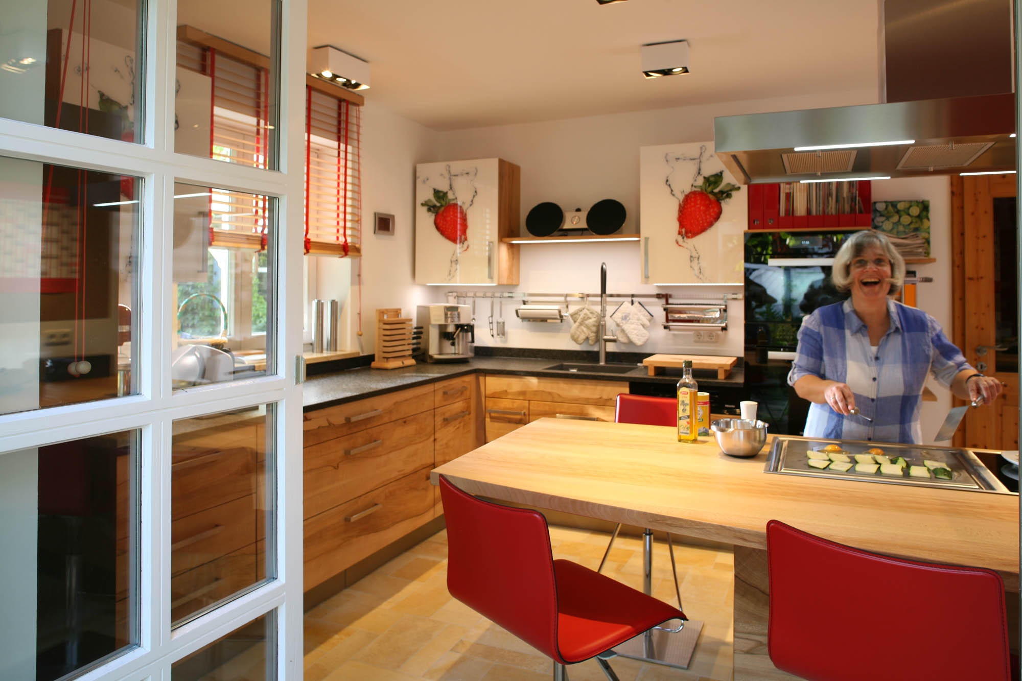 In vielen wissenschaftlichen Studien wurde nicht zuletzt in Schulen nachgewiesen, dass Massivholz einen senkenden Einfluss auf den Puls der Schüler hat, also ist Massivholz in Schlaf- und Kinderzimmern am wichtigsten. Dass bei uns aber alle Möbel, auch Küchenkorpusse aus Massivholz gefertigt werden, hat nicht nur mit der Wohngesundheit, sondern vor allem mit der Lebensdauer und damit dem Werterhalt zu tun. Wenn wir 28 Jahre alte Küchen unserer Kunden nachölen, einige Beschläge einstellen, andere austauschen, ist der Küche ihr Alter nicht mehr anzusehen; das geht besser, als bei uns selbst. Wenn wir sie noch dazu umbauen, mit neuen Geräten auf den technisch neuesten Stand bringen oder sogar umziehen, kommt noch eine ganz andere Qualität ins Spiel: Einzelanfertigung und lebenslanger Service. Der wäre an sich ja nicht an Massivholz gebunden, aber nur dort lässt er sich eben auch mit Freude und Erfolg verwirklichen.