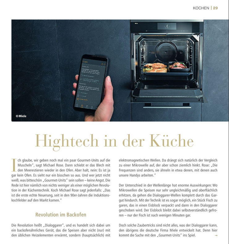 Sie waren einst in Unterkrumbach zu Gast, wo ich von der wohlorganisierten Vorgehensweise und deren geballter Küchenkompetenz beeindruckt war, aber auch wir konnten mit nicht ganz alltäglichen Geräten wie Druckdampfgarer, Profivakuumierer und Schockfroster einiges Neues beitragen. Vielleicht entstand der Artikel „Hightech in der Küche“ im Lifestylemagazin ja aus diesem Erlebnis, kombiniert mit der Tatsache, dass wir die ersten waren, die im Nachhaltigkeitsblog über persönliche Kocherfahrungen mit dem neuen Miele-Dialoggarer berichteten, denn der interessierte ihn, wie man im Artikel sieht, ungemein.