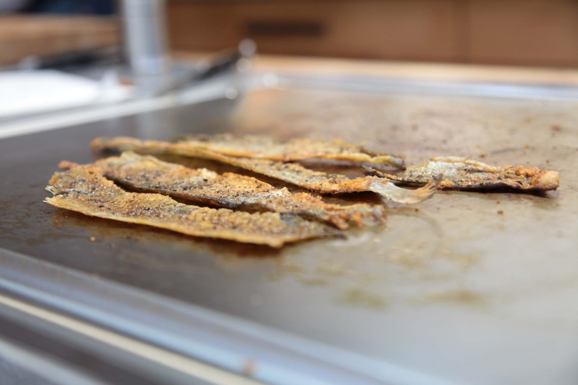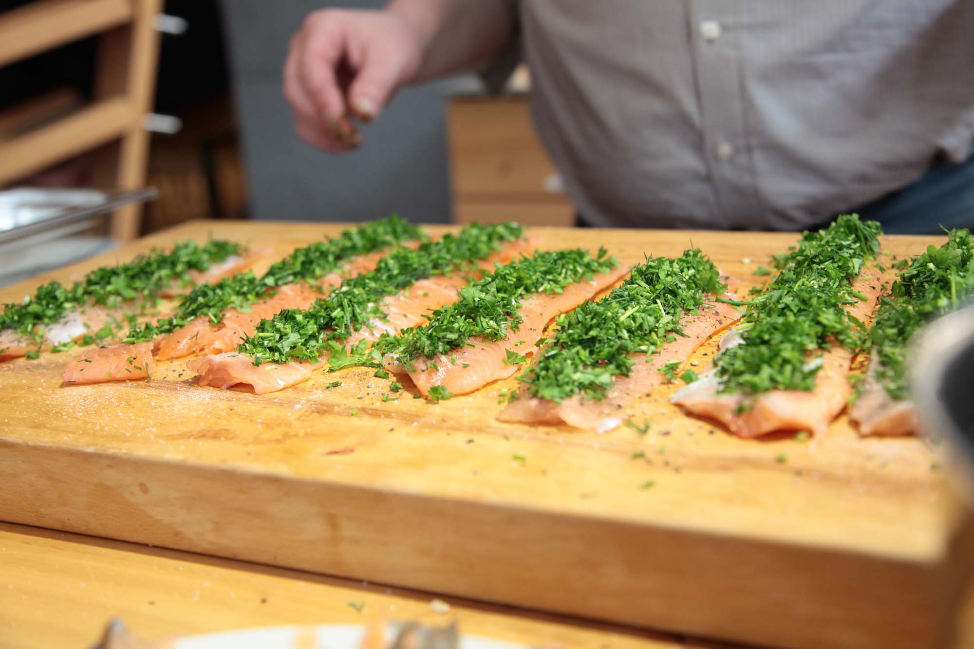 Natürlich durfte Seviche – der nur mit Limettensaft denaturierte Saibling – nicht fehlen und dazu gehört bei uns die gebratene Fischhaut zum Knabbern (hier ist unser aktualisiertes Sevicherezept). Auch die Filets wurden am Tepan Yaki zubereitet und die Kräuterröllchen im Dampfgarer gegart (95 Grad 12 Minuten).