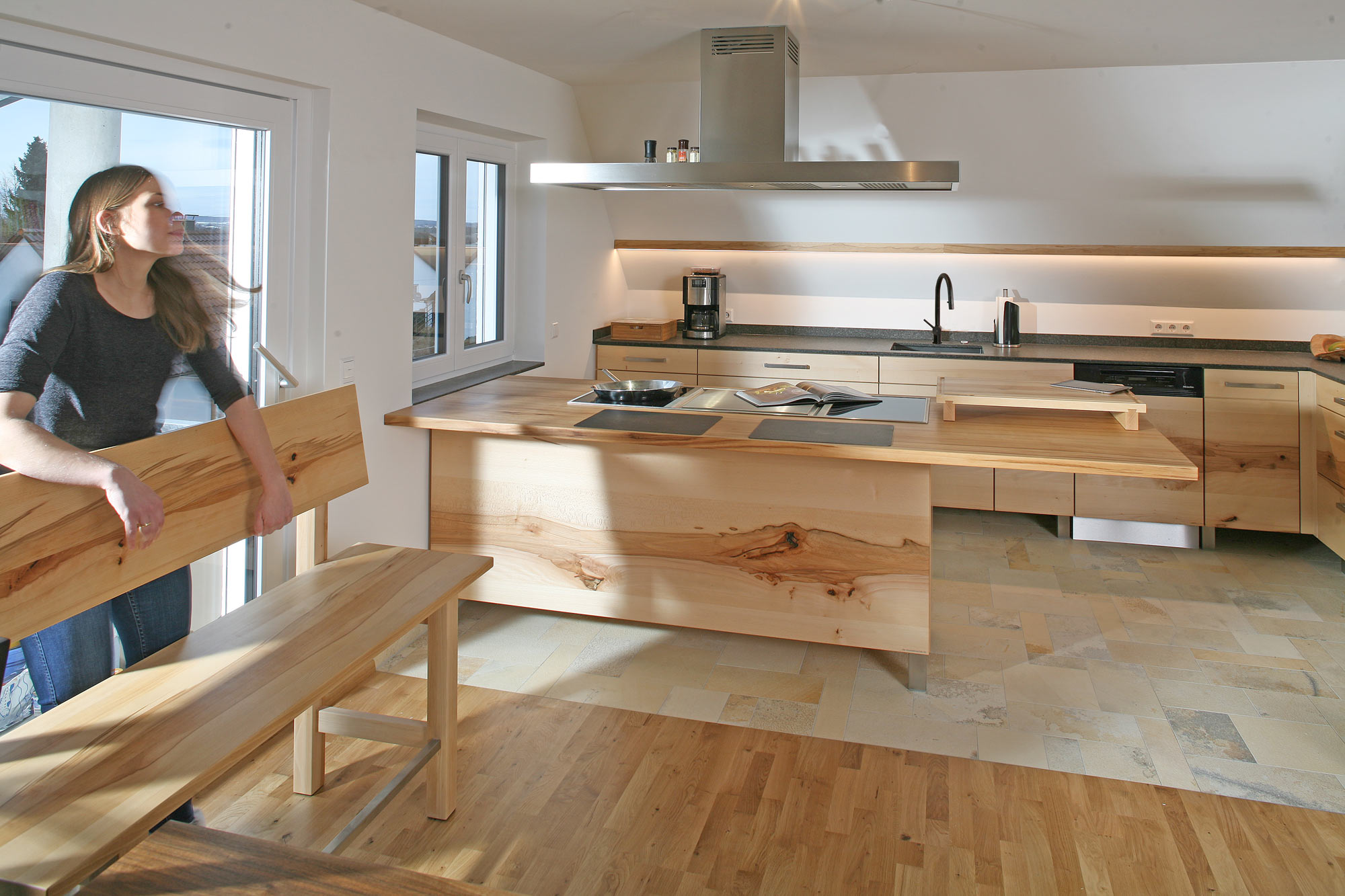 Die moderne Formensprache wollten und wollen wir noch heute mit ehrlichen Materialien, wie Massivholz, Glas oder Edelstahl verbinden. Bald begannen wir, neben der Nachhaltigkeit auch die Regionalität als Wert zu formulieren. Mit Lesungen, Konzerten, Workshops und Werkstattgesprächen bringen wir die Idee der Einzelanfertigung von Möbeln, aber auch Ökologie und regionale Wirtschaftskreisläufe an die Frau, die Männer sind – rein statistisch – eher technisch interessiert. Ganzheitlichkeit von der regionalen Waldschöpfungskette über die eigene Stromerzeugung bis zum Apfelsaft der Streuobstwiesen; Ganzheitlichkeit vom Wald bis zur Rücknahme von nicht mehr gebrauchten Möbeln.
