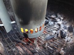 Als begeisterter Händler der Kugelgrills von Rösle und Autor zahlloser hilfreicher Blogartikel über deren Verwendung, ist es schon komisch, viele Grilltipps des Vaters jenes Babys aus dessen Kurs bei Weber zu übernehmen, aber in der Medizin sagt man, „wer heilt, hat recht“ und bei den Grillneurotikern „wer unaufwändig anzündet, hat recht.“ Antoine zerknüllt Küchenkrepp und begießt es satt mit einfachen Sonnenblumenöl auf einem Tellerla. Am Kohlenrost anzünden, Kamin draufstellen und es funktioniert einfach so genial, dass ich keine klassischen Anzünder mehr verwende.