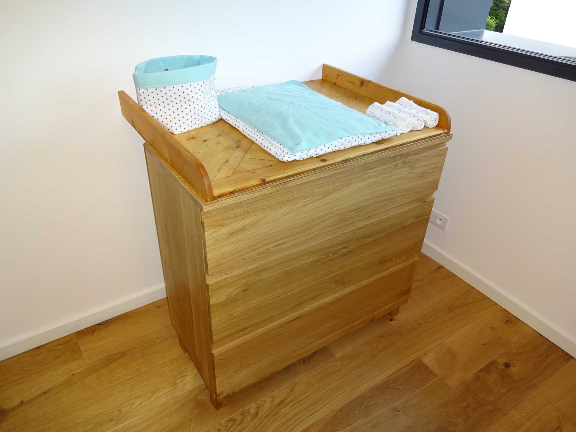 Aus aktuellem Anlass brachten wir mal wieder Möbel mit nach Paris. Diesmal eine Eichenkommode, die mit einer generationenüberdauernden größeren Platte ergänzt, auch als Wickelkommode verwendet werden kann. Wichtig ist dabei, dass man das der Kommode davor und danach nicht ansieht und das sollte dank wohl durchdachter Befestigungen gut funktionieren. Die Platte wird so montiert, dass die Kommode vorne bündig endet, also hinter der Kommode noch Stauraum für Allerlei entsteht und auch die obere Schublade der Kommode nicht durch die Platte unbenutzbar wird. Wem selbst schon Babys plötzlich vom Wickeltisch gekullert sind, weiß die große Tiefe und Breite zum Abstellen des anspruchsvollen postnatalen Equipments zu schätzen!“