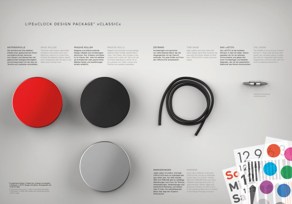 Die Länge des Gummibandes ist frei wählbar, weil die Steuerung über ein Programm am Mobiltelefon erfolgt, die beim ersten Umlauf von der Motorrolle (Master) über alle Umlenkrollen (Slaves) zurück zum Master die Entfernung misst. Danach sind wirklich alle Ideen frei programmier- und an der Wand markierbar. Dafür gibt es Aufkleber mit den Zahlen der Uhrzeit, farbige Punkte, man kann aber genausogut Bilder über die „KindinKindergartenbringZeit“, „Middaach“, Feierabendbier oder Bettgehzwang an der Wand platzieren.