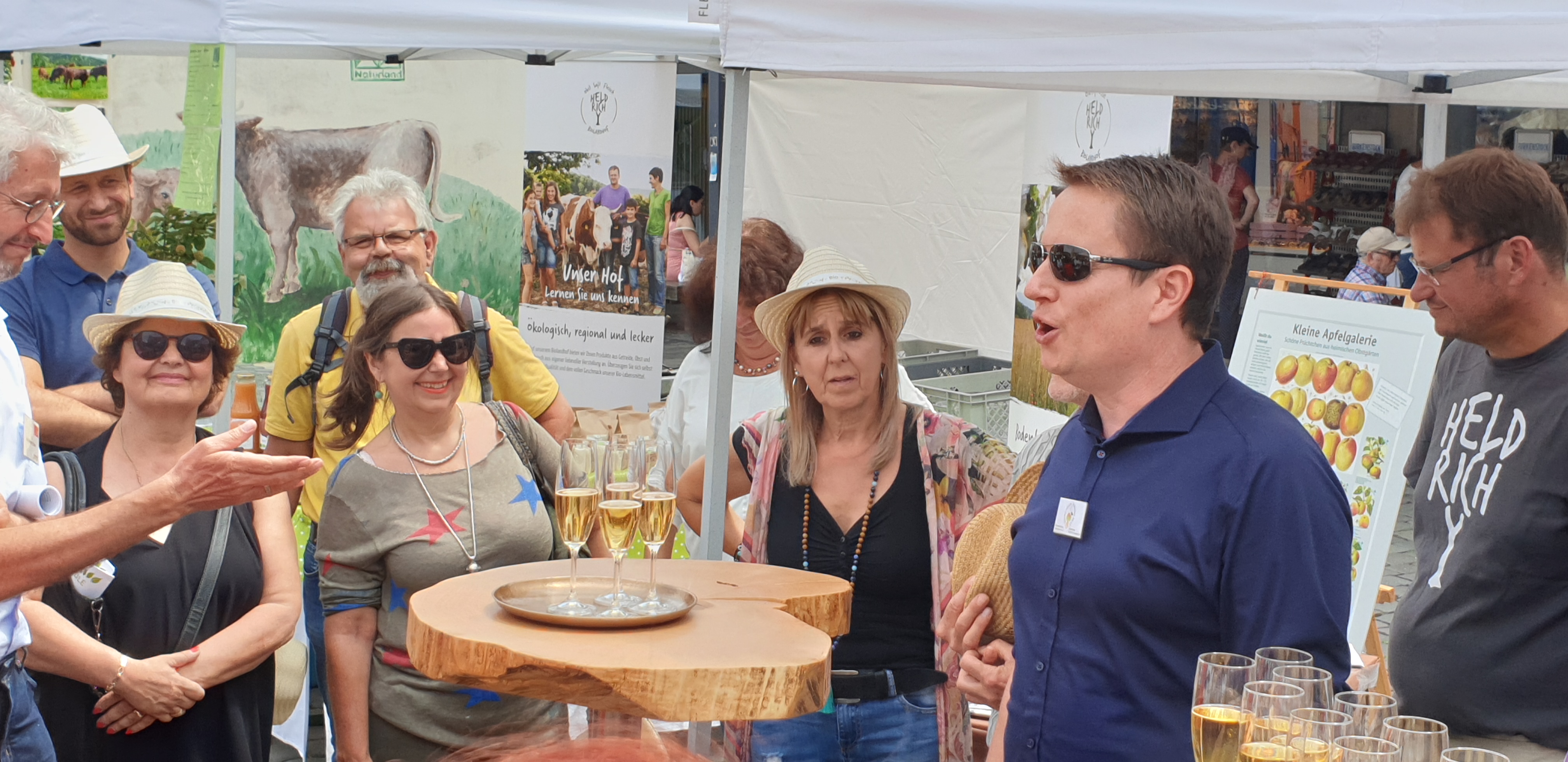 Taiwanische Touristen genießen die Getränke der Streueobstinitiative auf der BioErleben in Nürnberg – der Stehtisch aus Apfelbaum ist von den Möbelmachern