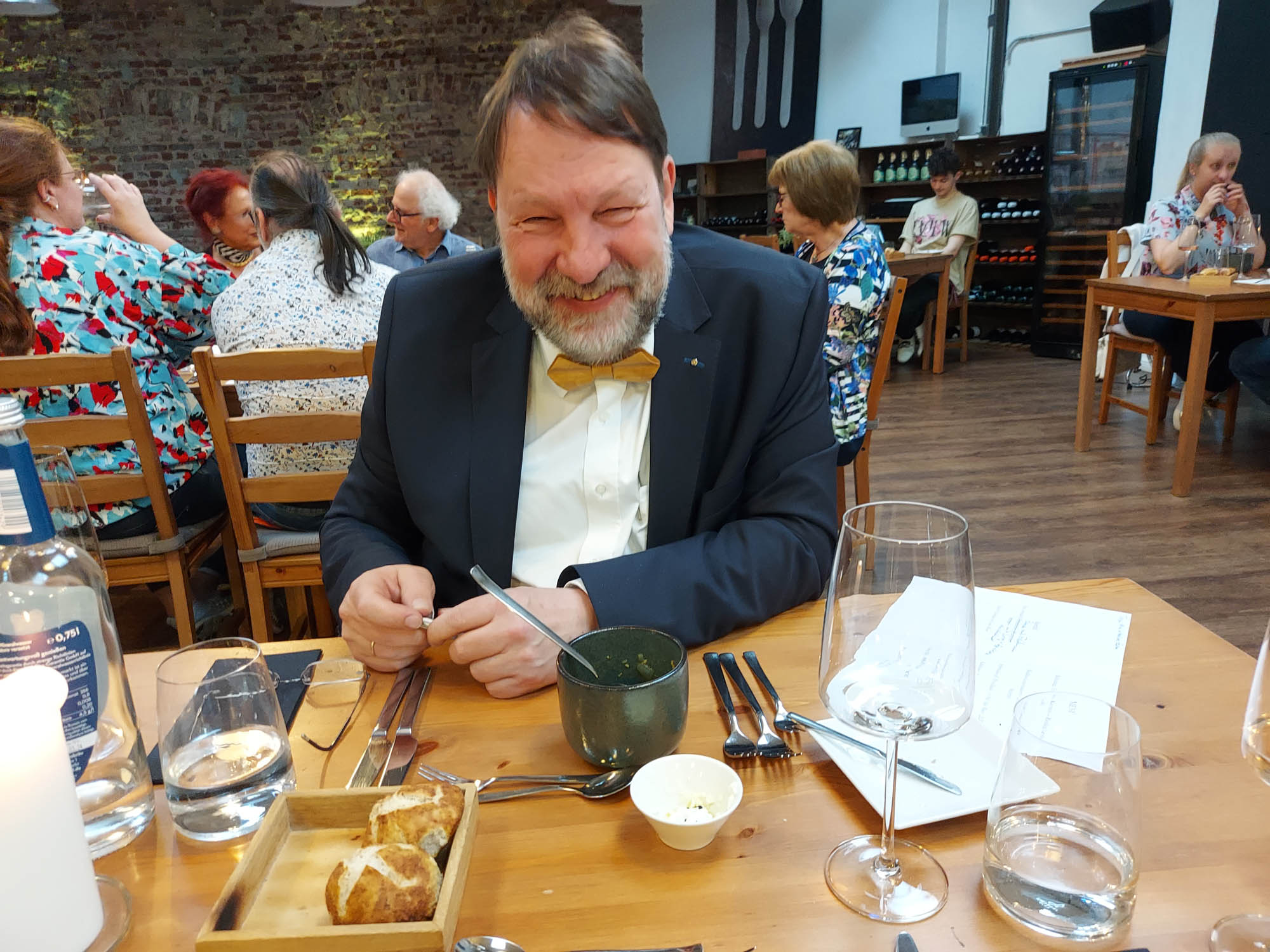 Die Präsentation von „Wirte mit Werten“ soll natürlich nicht ohne den Initiator dieser Gruppe stattfinden und das ist Till-Jonas Heinz vom ess.brand. Also nahmen wir uns vor, ihn bald in seinem Restaurant zu besuchen, und da kam zeitgleich die Einladung zum „Inner circle“, die er gemeinsam mit Sebastian Kunkel und im Geiste seines im letzten Jahr an Corona verstorbenen Vaters veranstaltet. Das Foto stammt von einer Slow Food-Veranstaltung in der Zirbelstube im Jahr 2014.