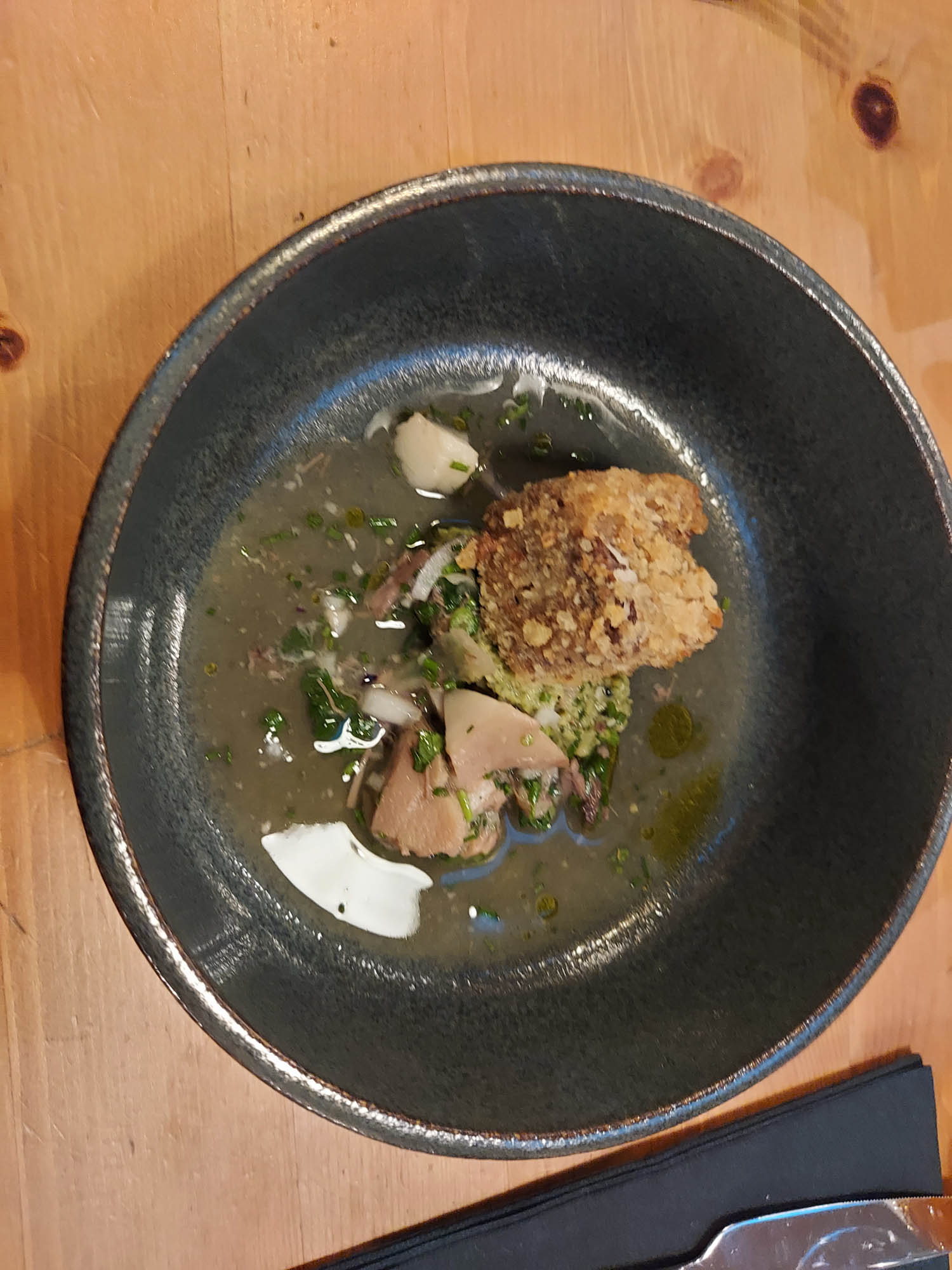Die Lunge (Beuschel) schmeckte noch am ehesten nach Innereien (was immer das bei dieser Bandbreite der Geschmäcker sein mag). Aber dank Kapern und Pilzen war es leicht säuerlich und mit dem Semmelknödel (-stückchen – ein ganzer hätte das Konzept der 10 Gänge ruiniert) ein wahrer Genuss.