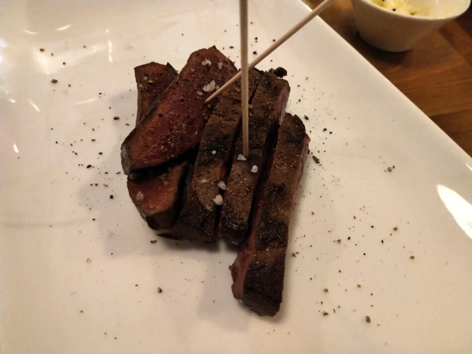 Das gebratene Rinderherz war Ninas Fleischfavorit, es hat eine deutlich festere Konsistenz als ein Steak, wie man sie auch vom Hühnerherz kennt. Ein sehr scharfer Pfeffer verfeinerte. Es war auf den Punkt gebraten, wir hatten nur das Problem, dass der Teller mit Ninas Angstgericht Nierenzapfen angekündigt war.