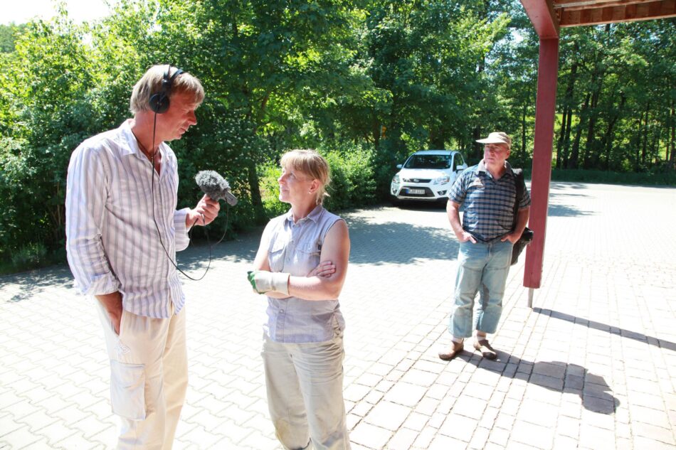 Wolf Gaudlitz interviewt Ute Danzer im Auftrag des Bayerischen Rundfunks im Mai 2012 in Unterkrumbach, im Hintergrund Flechtmeister Peter Sturm