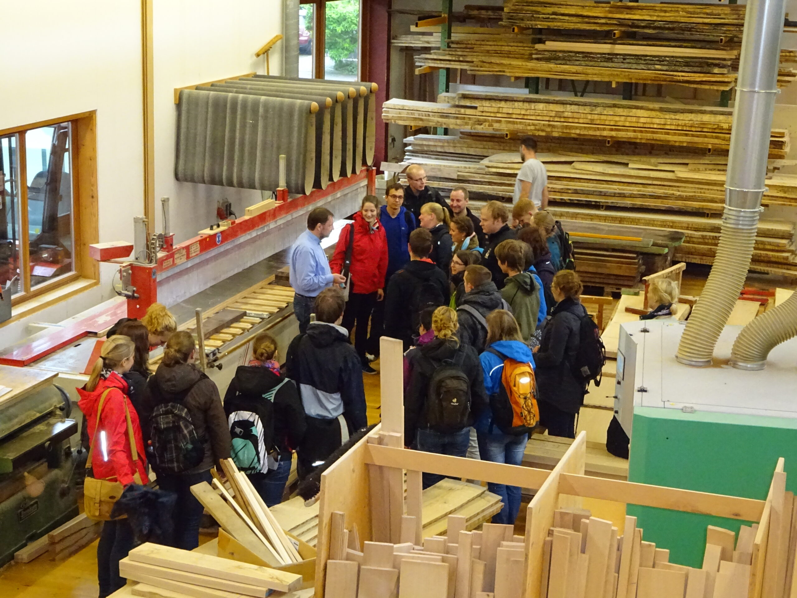 „Die 1997 gebaute Werkstatt in Holzständerbauweise ist für uns Arbeitsplatz, Holzlager und Veranstaltungsfläche in einem. Unser Holz beziehen wir aus der Region, lassen es vor unserer Werkstatt einsägen und im Holzlager im Außenbereich trocknen, bevor es in unserer Trockenkammer auf die gewünschte Holzfeuchte gebracht wird und endlich in die Werkstatt kommt. Hier wird das Holz aktuell von fünf Gesell*innen, zwei Meister*innen und zwei Auszubildenden zu Möbeln verarbeitet. Die Holzreste werden gehackt und zu Briketts gepresst, die wir dann wieder für die Beheizung des Gebäudes nutzen können und eine Photovoltaikanlage auf dem Dach versorgt uns mit Strom.