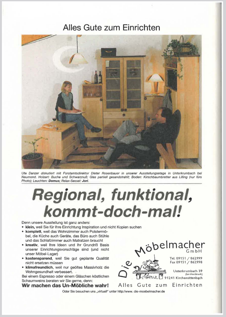 Umso wichtiger, dass wir die Angebote an Nahrungsmitteln und handwerklichen Leistungen aus der Region gerade in nicht ganz leichten Zeiten nicht nur wahrnehmen, sondern auch nutzen und fördern. Sie stehen für Nähe und Qualität und sind auch nicht von Boykott, Zöllen, Einfuhrstopps oder Transportproblemen bedroht. Die heimischen Landwirte, Handwerker und Dienstleister brauchen uns als Käufer und Partner – damals und heute – und wir Möbelmacher brauchen Sie als unsere Kunden.“