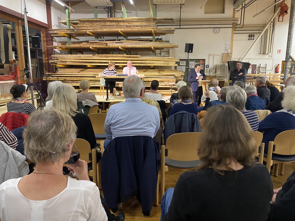 Wir freuen uns riesig, dass die Kompassnadel, naja, vielleicht auch das Navigationssystem die beiden heute wieder nach Franken führte und möchten Ihnen auch die anderen Gäste vorstellen: Die Künstlerin der Metropolregion 2023 Ute Plank hat mit ihren Bildern unsere Ausstellung bereichert und wir laden Sie in der Pause und nach der Lesung noch herzlich ein, dort nicht nur an die Wände, sondern auch auf die Tische zu schauen, auf der die Porzellankunst von Angelika Krauß zu sehen und vorsichtig zu berühren ist. Nicht unerwähnt wollen wir lassen, dass man die Kunst nicht nur genießen, sondern auch kaufen kann, genauso, wie auch alle Küchen und Möbel, die Sie hier sehen keine Dekoration für die Lesung sind, sondern die Basis für solche Abende. In der Möbelbranche, wie in vielen anderen, außer der Rüstung und Künstlicher Intelligenz ist es gerade nicht leicht. Unsere Veranstaltungen sollen Sie nicht zuletzt auch inspirieren, Ihre Einrichtung aufzufrischen, denn unser Slogan Alles Gute zum Einrichten, enthält nicht nur die Küchen und Möbel aus dem Massivholz der Region, sondern auch Polstermöbel, Beleuchtung, Schlafsysteme, Fenstergestaltung, eben alles, was in einem Haus oder Büro zwischen Decke und Fußboden passt.