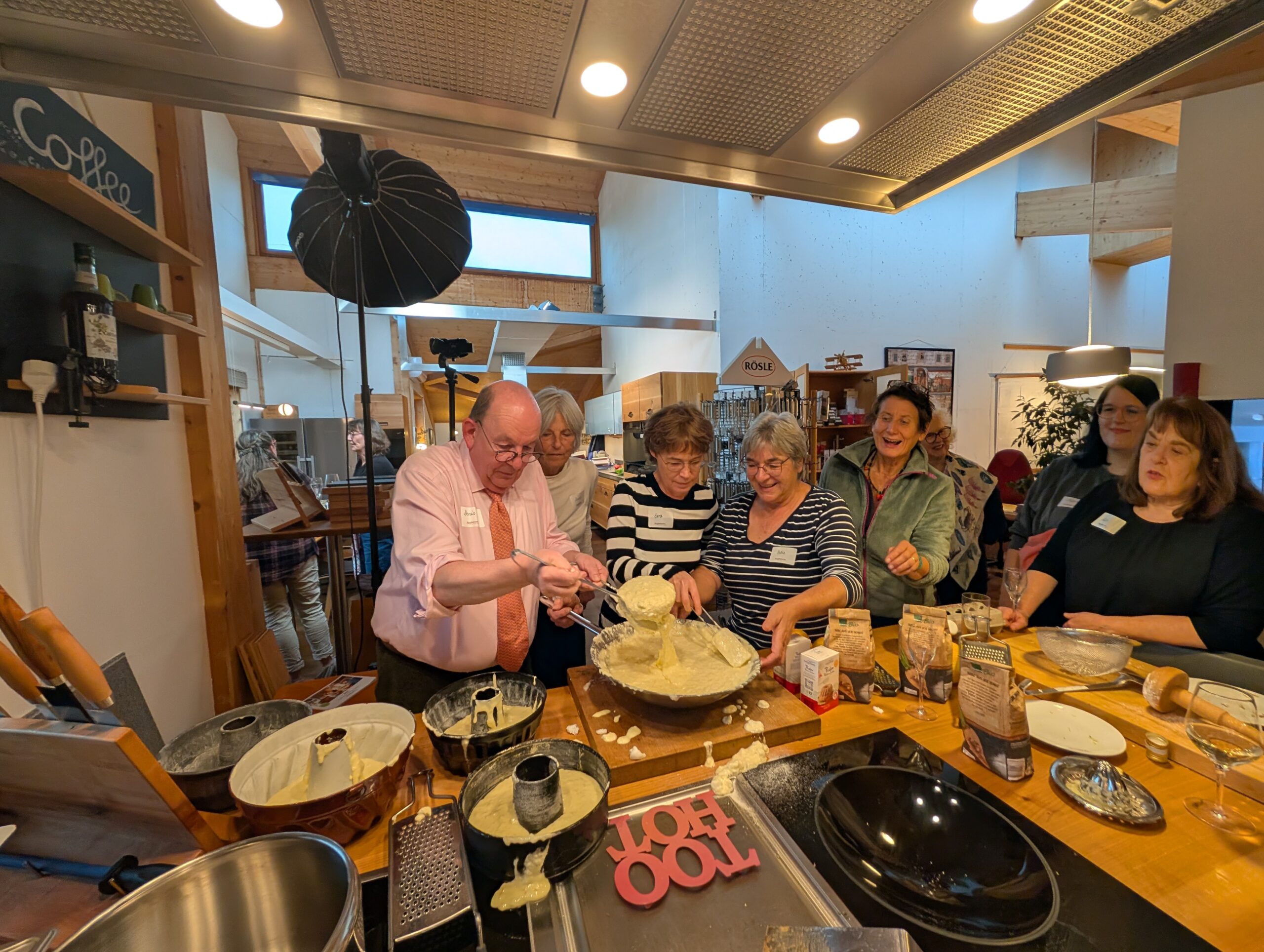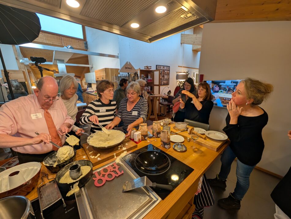 Die engagierten Köchinnen und Köche standen bereit, leider waren Denis und Eva wegen Einkaufsschwierigkeiten am Morgen noch nicht da, und nach seiner Ankunft begrüßte Denis und erklärte alle kafkaesken Hintergründe, worauf unsere versteckte Panik – es könnte zeitlich knapp werden – noch zunahm. Es bewahrheitete sich zwar (wir waren eigentlich nicht rechtzeitig fertig), allerdings hat es niemand mitbekommen, also cool bleiben, das Essen war fein, die Gäste waren begeistert. Im Nachhinein meinte Denis, er hätte den Aufwand wohl ein wenig unterschätzt, hihi.