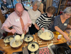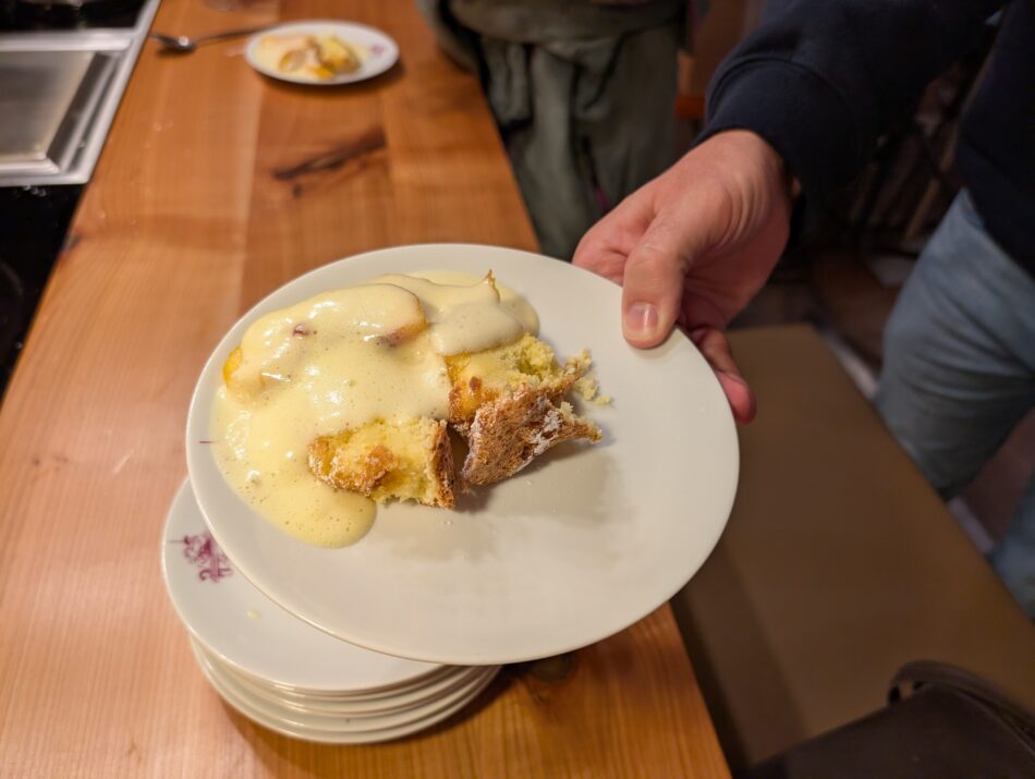Früher hat man das im Wasserbad gemacht, heute kann ein Induktionskochfeld, oder noch besser Induktionswok die Aufgabe der genauen Temperatursteuerung übernehmen, viel rühren muss man trotzdem. Aber Katrin und Eva eilten ihm zur Hilfe und als ich endlich doch noch Eier auf unserem Gelände fand und keuchend anbrachte, war die Creme dann schon perfekt.