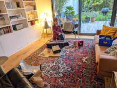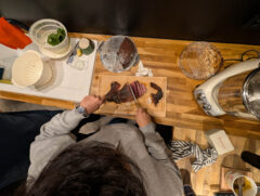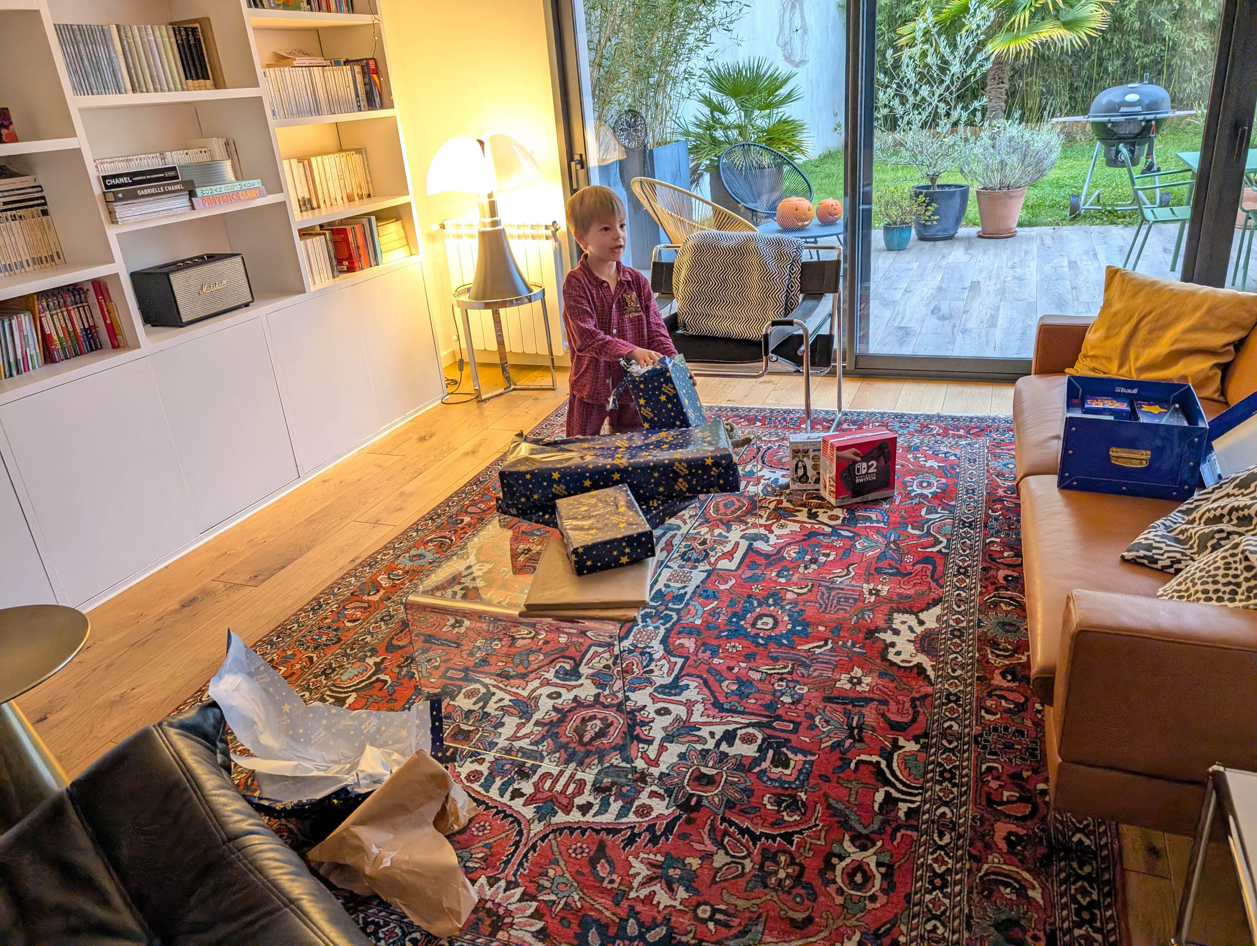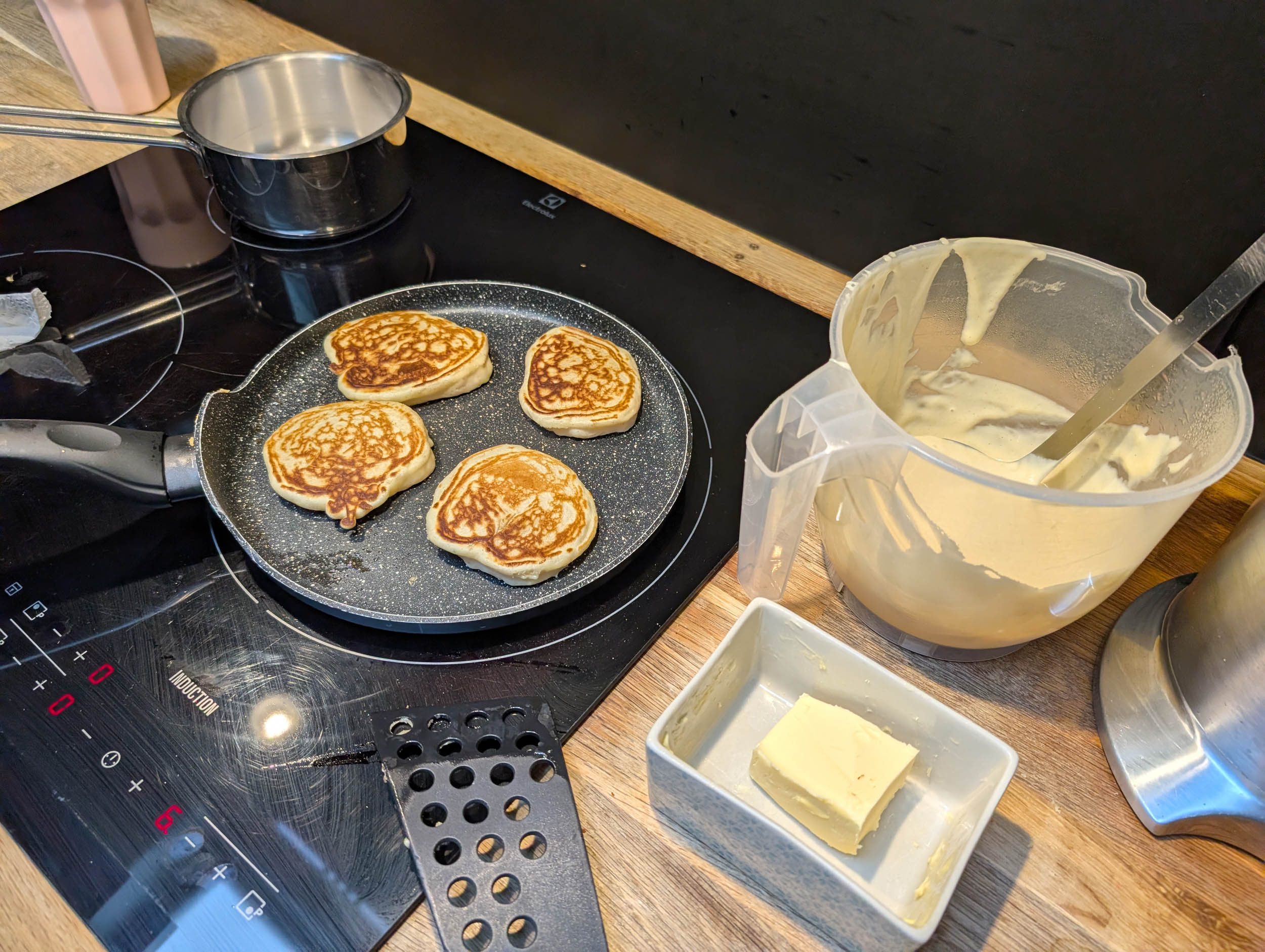 Am Donnerstag sind wir losgedüst. Freitags mussten natürlich schon ungewöhnlich früh die Geschenke ausgepackt werden, dafür buk Laura köstliche Pancakes zum Frühstück. Ungefähr fünfmal in einer Pfanne, auf dem großen Tepan Yaki wäre das auf einmal gegangen, aber diesmal hatte ich ihn gar nicht dabei. Ich persönlich mag die Pancakes ja vor allem in der pikanten, nicht süßen Variante. Am Tepan kann man sie übrigens auch wunderbar aufwärmen, weil er dank Thermostat die Temperatur konstant hält.