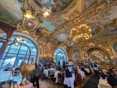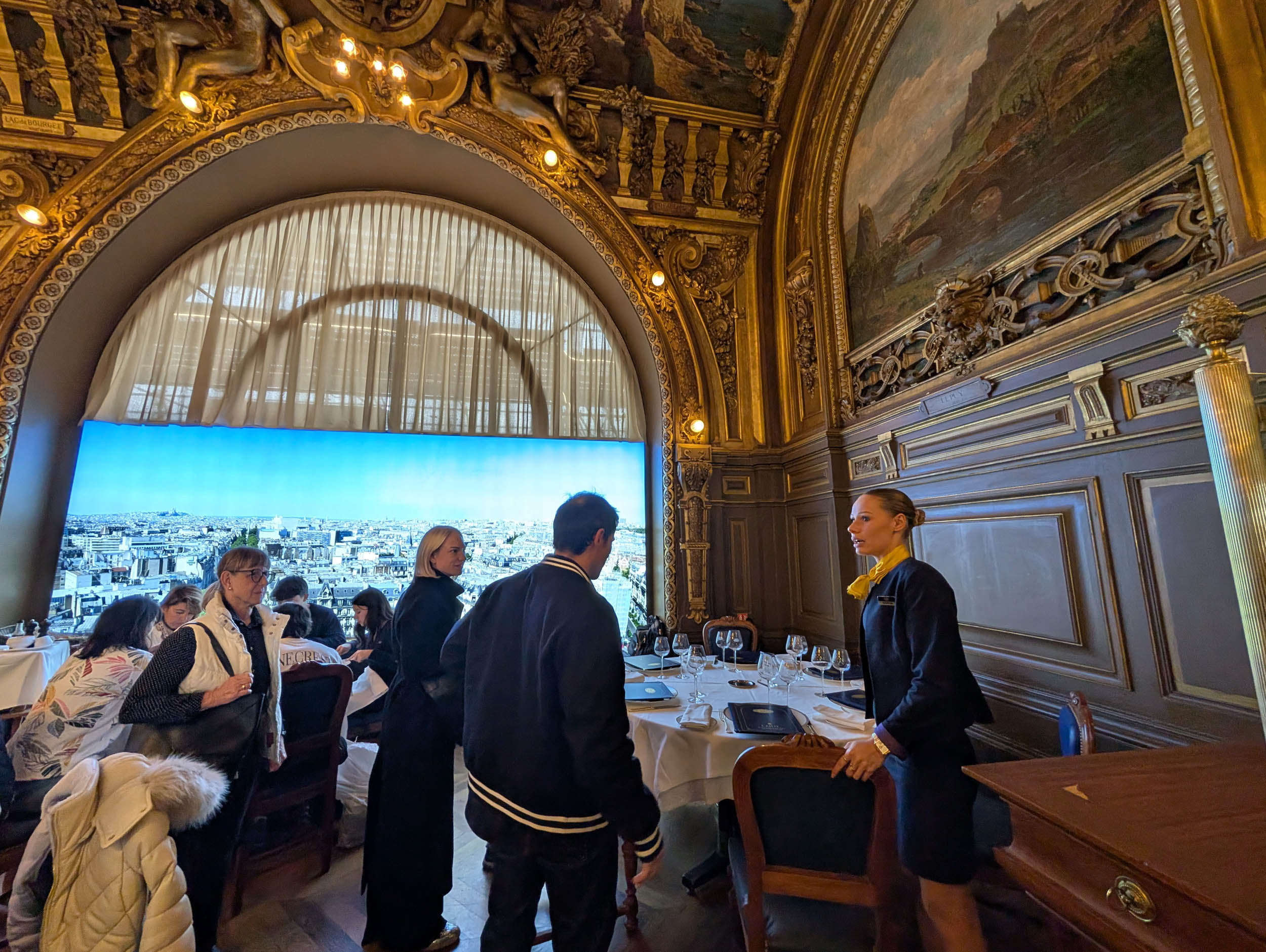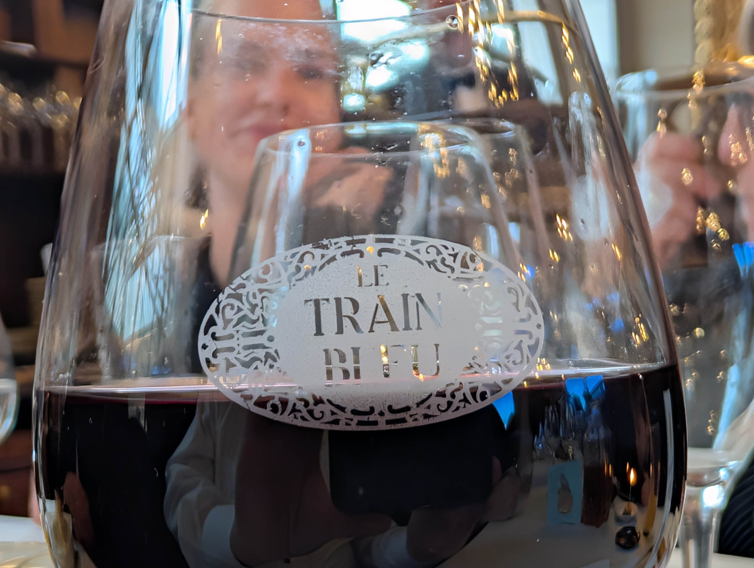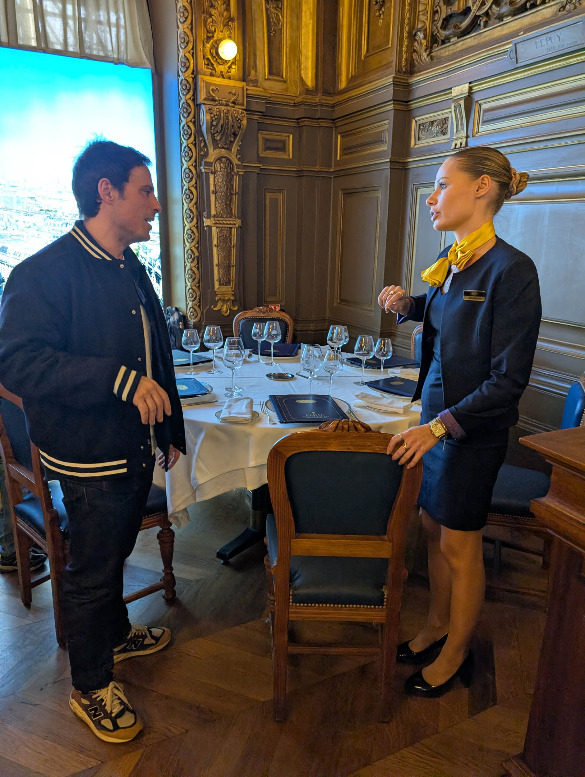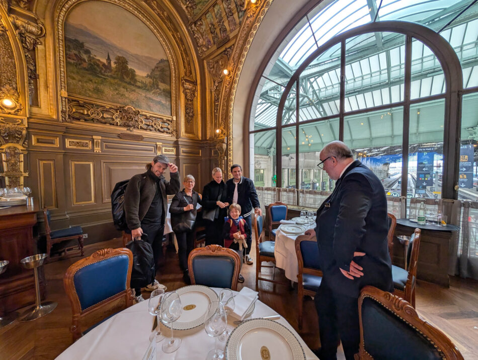Nach der schwierigen Diskussion über den eigentlich reservierten Platz suchten wir eine eher engere Alternative. Wir wollten nämlich dort sitzen, von wo aus man Tristan aus dem Zug steigen sieht und nicht das viel zu hell leuchtende und nervende Baustellenplakat. Aber das hat dann leider doch nicht geklappt. Dafür war der TGV (steht für Train à Grande Vitesse, also Hochgeschwindigkeitszug) absolut pünktlich (!), also genossen wir die Atmosphäre in diesem ebenso historischen, wie riesigen Gebäude mit 200 Sitzplätzen, welches eine ebensolche Küche und viele Salons beherbergt. Der aktuelle Küchenchef ist Samir Balia, in Zusammenarbeit mit dem renommierten Zweisternekoch Michel Rostang, vom gleichnamigen Restaurant, dessen Gerichte auf der Speisekarte jeweils mit seinem Namen genannt werden.