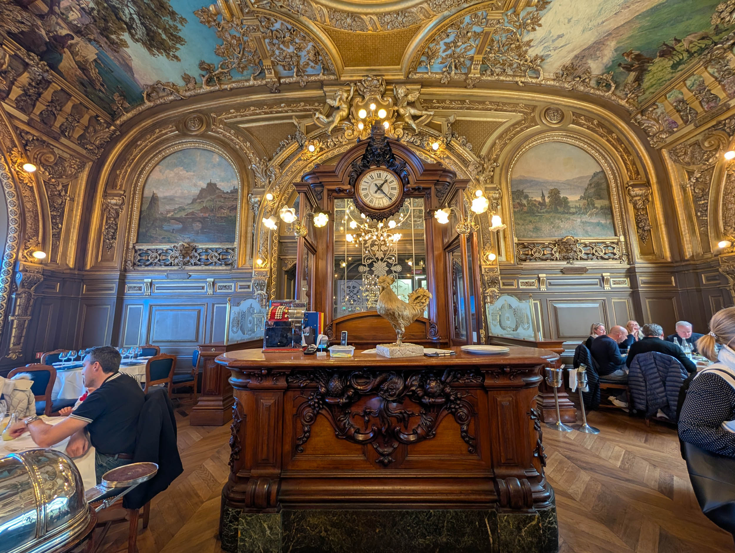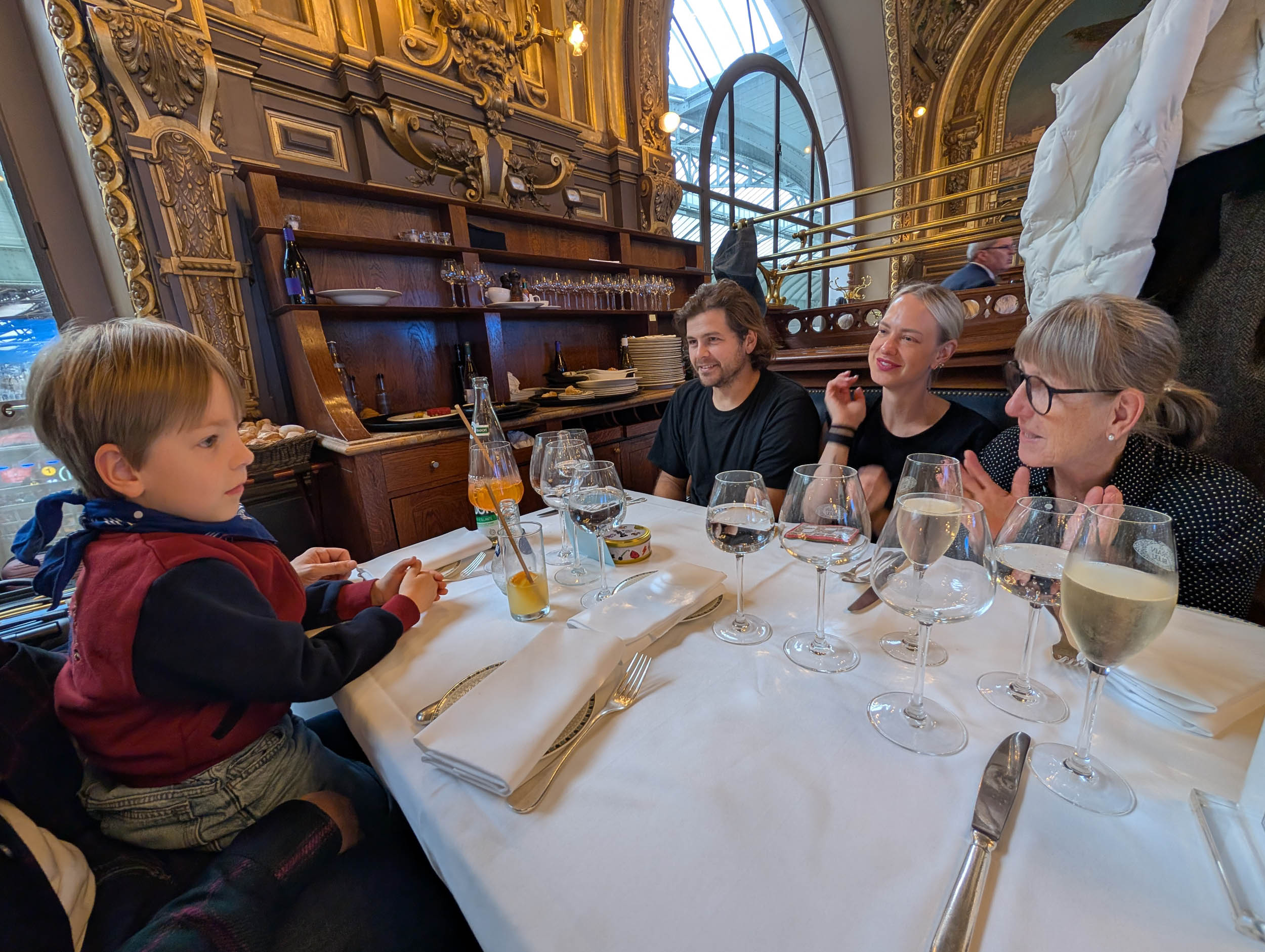 Lauras guten Freund und gleichzeitig Leopolds Paten Tristan holten wir im Bahnhof Gare de Lyon ab, der auch eine sehr alte Bahnhofskneipe namens Le Train Bleu besitzt. Das Restaurant wurde dereinst am 7. April 1901 durch Präsident Émile Loubet eröffnet und im Stil der Belle Époque etwas üppiger ausgestattet, als andere Bahnhofskaschemmen.