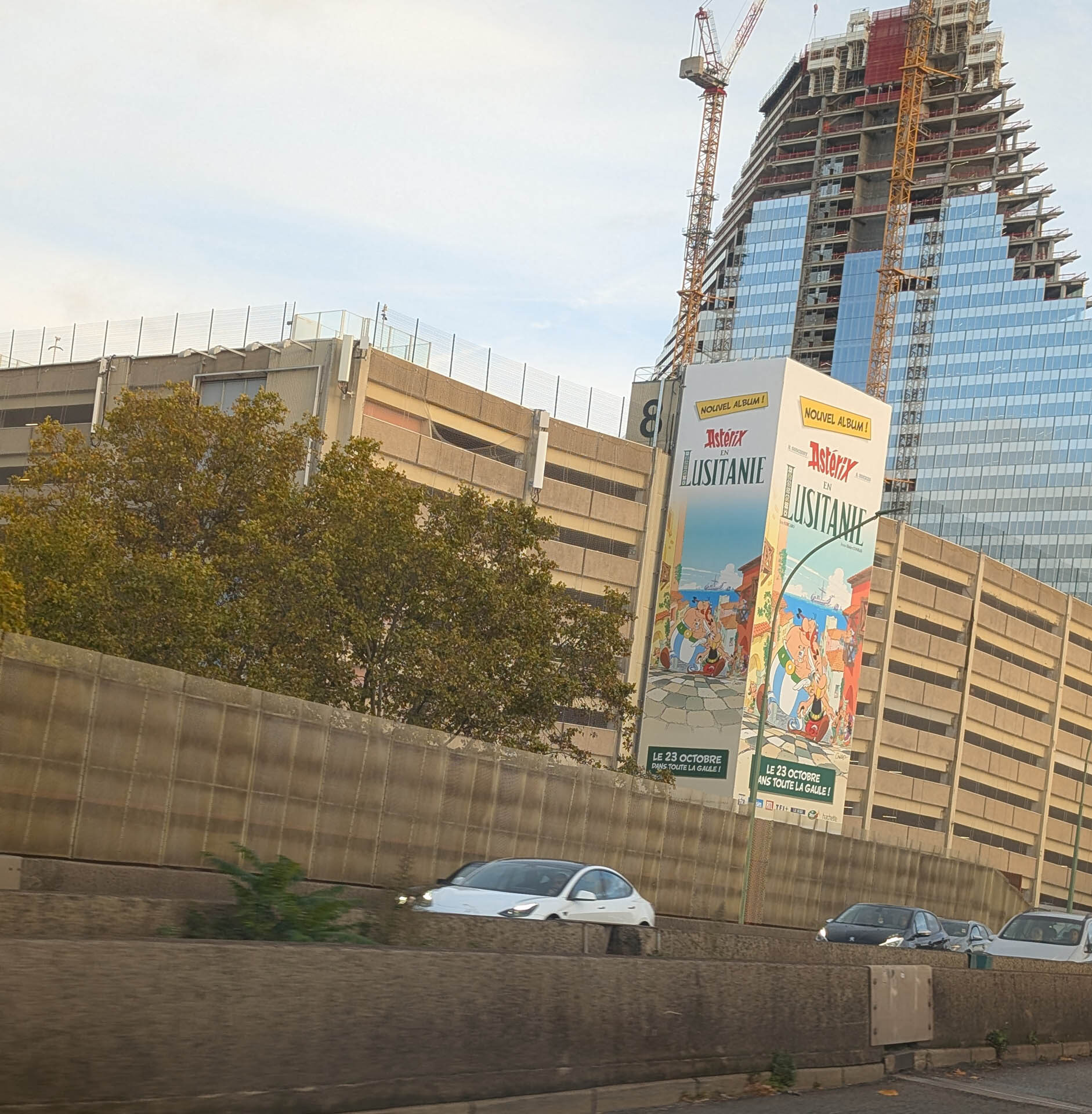 Wir haben ja schon im Newsletter 224 das neue Asterix in Lusitanien (Portugal) mittels Rätsel zelebriert (das übrigens noch niemand gelöst hat, es ging um den originellen Namen der dort erwähnten Werbeagentur). Aber wir hätten nie gedacht, dass Paris soooo voller Asterixwerbung ist, am Gare de Lyon, in jeder Buchhandlung oder sogar auf der Peripherie (wie der mittlere Ring in München) vor der aktuell größten Baustelle. Die Franzosen habe eine ganz andere Liebesbeziehung zum Comic, als die Deutschen.