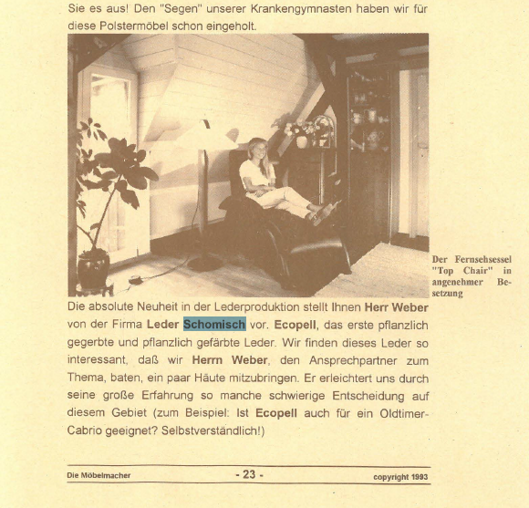 „Die absolute Neuheit in der Lederproduktion stellt Ihnen Herr Weber von der Firma Leder Schomisch vor. Ecopell, das erste pflanzlich gegerbte und pflanzlich gefärbte Leder. Wir finden dieses Leder so interessant, dass wir Herrn Weber, den Ansprechpartner zum Thema, baten, ein paar Häute mitzubringen. Er erleichtert uns durchseine große Erfahrung so manche schwierige Entscheidung auf diesem Gebiet (zum Beispiel: Ist Ecopell auch für ein Oldtimer-Cabrio geeignet? Selbstverständlich!)“