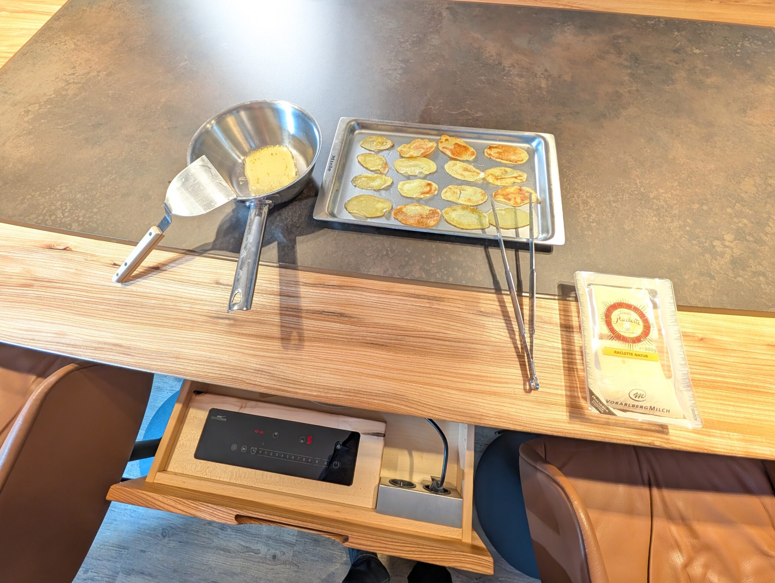 Weil wir keinen banalen Nudeltopf aufstellen wollten (in den man dann auch nicht reinschauen kann), haben wir uns für die mobile Tepan Yaki Platte und Kartoffelchips entscheiden. Denn mit Chips kann man jeden Käste zu Testen servieren, in der Sauteuse haben wir auf dem zweiten Kochfeld noch den Raclette-Käse geschmolzen und auf den Chips präsentiert. Aber prinzipiell kann man auf diesem Kochfeld mit allen (induktionstauglichen) Töpfen der Welt kochen.